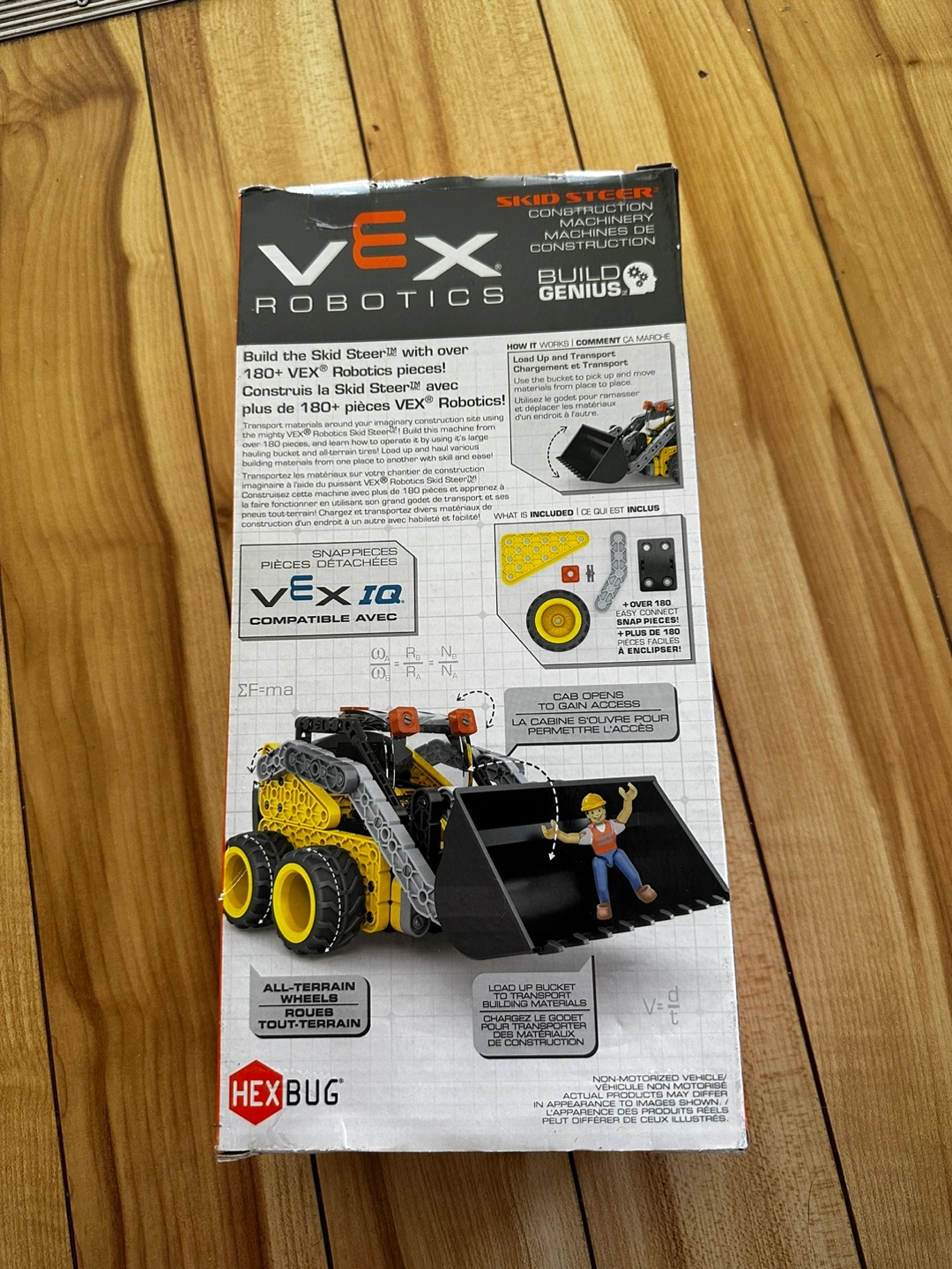 Brand new, unopened Vex Robotics Skid Steer construction set. Over 180 pieces. Includes construction worker figure. STEM starter kit. All-terrain wheels. Snap pieces. Compatible with Vex Robotics. Been opened but nothing has been touched , everything in place
