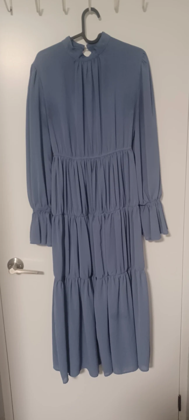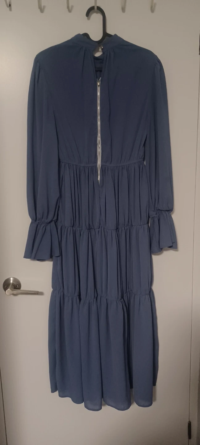 Here's a lovely blue tiered jumpsuit! It features long sleeves and a high neckline. Rad-cycled from an old dress to add a little flair! With added zipper back for easy wear you'll love this outfit!