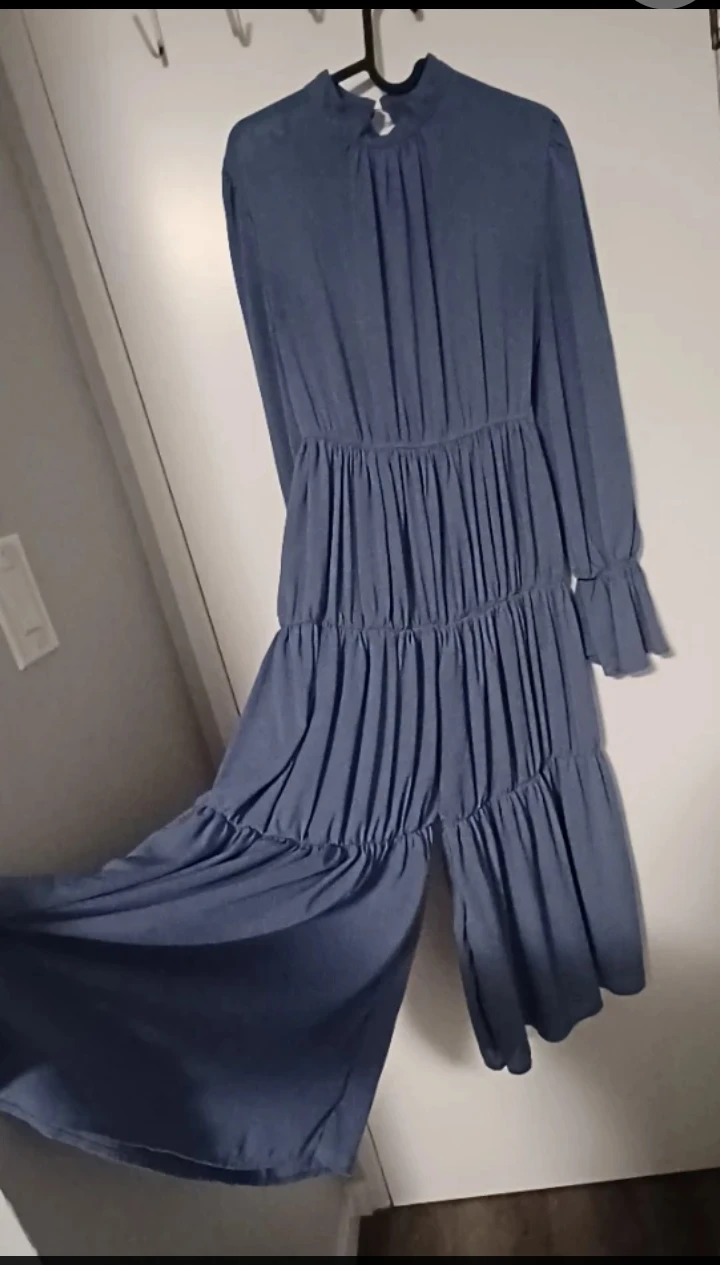 Here's a lovely blue tiered jumpsuit! It features long sleeves and a high neckline. Rad-cycled from an old dress to add a little flair! With added zipper back for easy wear you'll love this outfit!