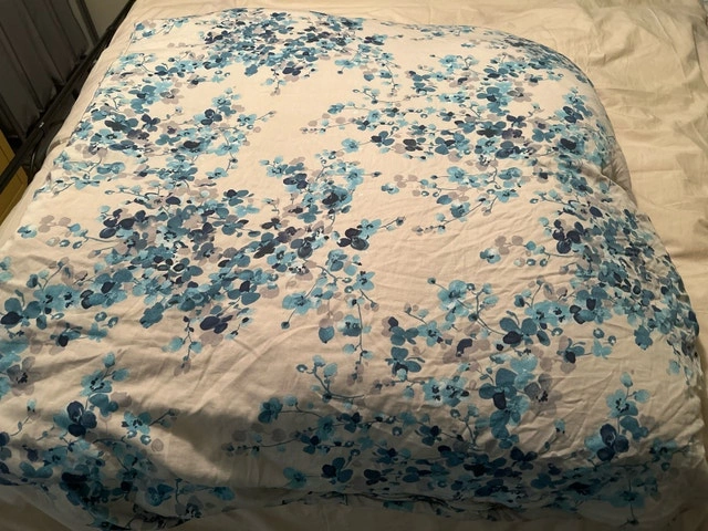 Received as a gift but is too small for the bed. Cover is a light tan colour with blue flowers. From smoke-free and pet-free home.