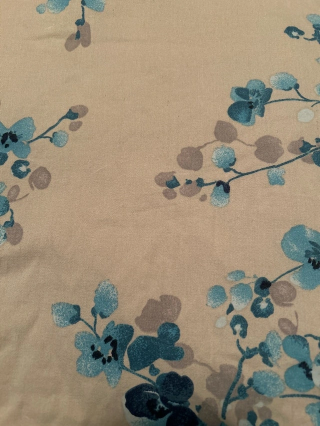 Received as a gift but is too small for the bed. Cover is a light tan colour with blue flowers. From smoke-free and pet-free home.