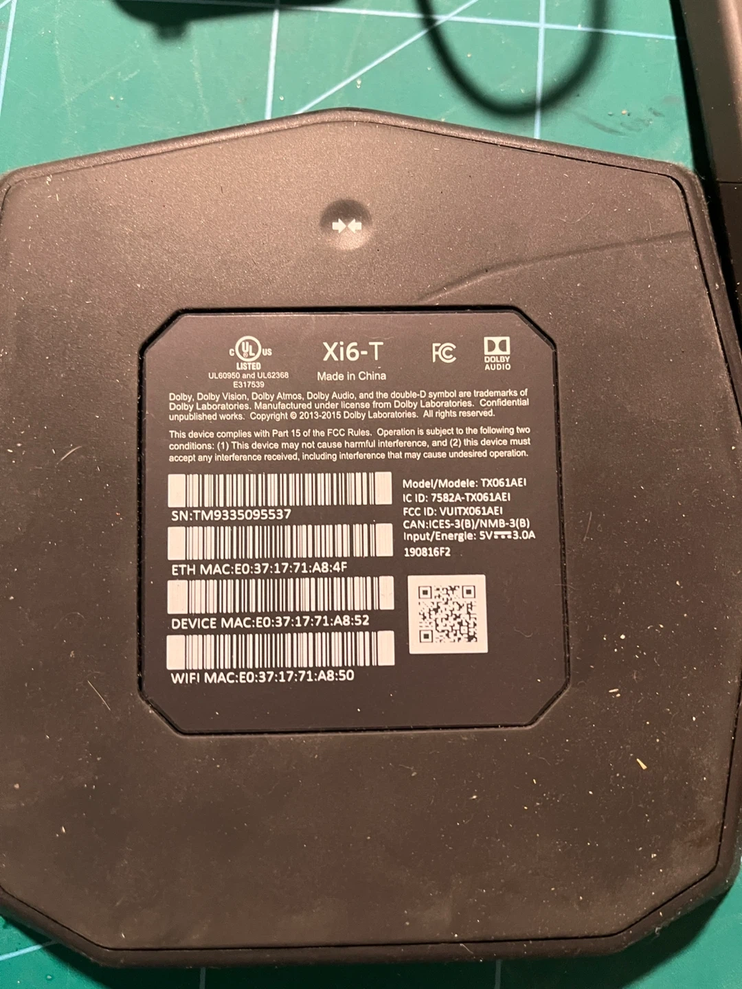This Rogers Xi6-T is a streaming box that connects to your TV. It comes with two remotes for easy control and a power adapter. The box itself is black with a unique geometric design on top. It supports Dolby Vision and Dolby Atmos.