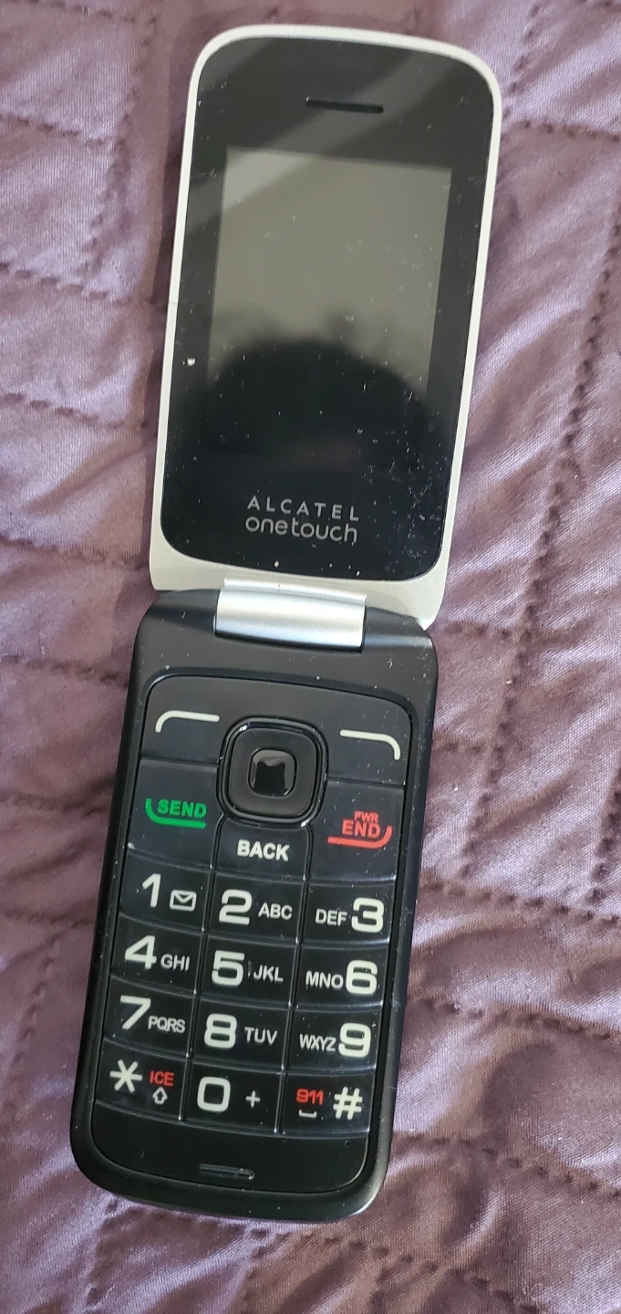 This is a black Alcatel One Touch flip phone. It has a color screen and a standard keypad for calls and texts. Simple to use!