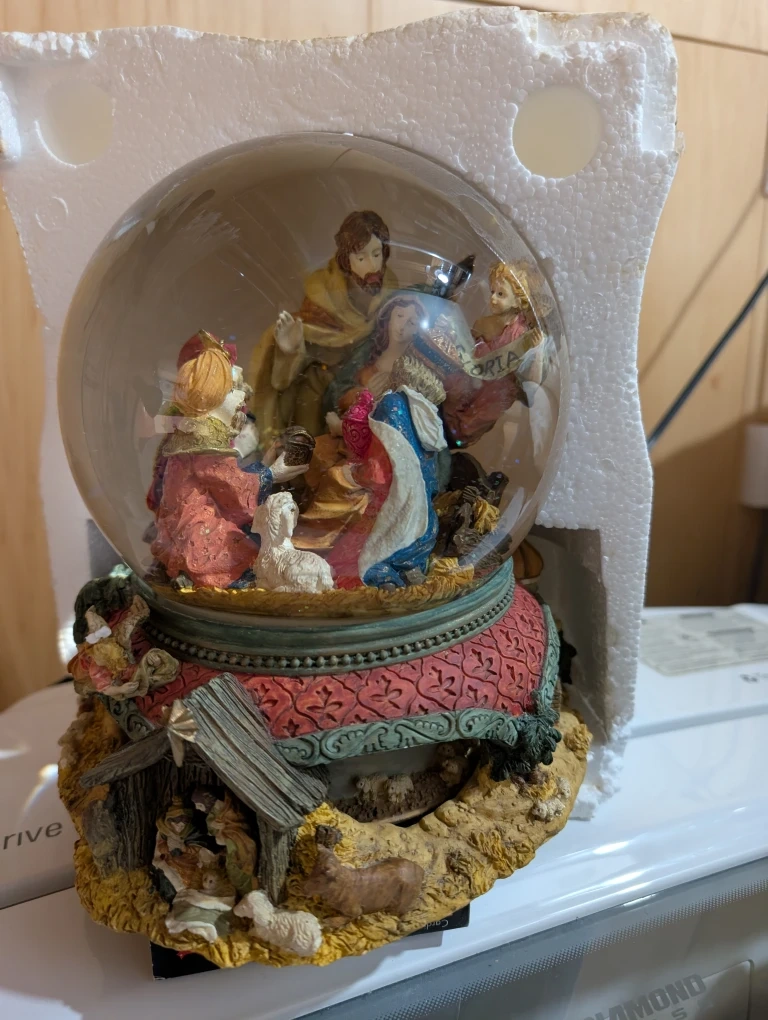 This is a vintage, Kirkland Signature Musical Waterglobe with Revolving Base. It comes in its original box. It's a beautiful piece to add to your holiday decorations