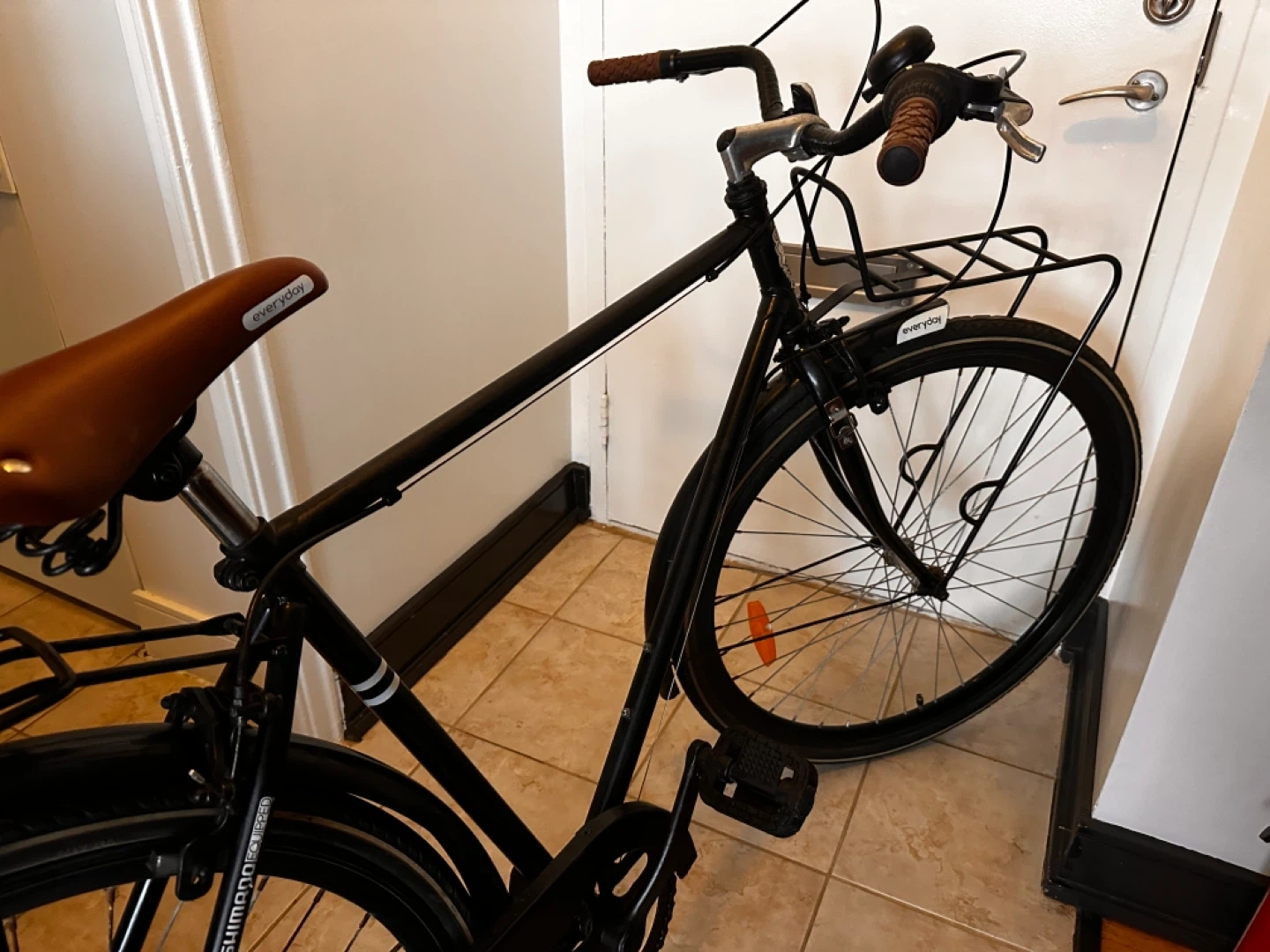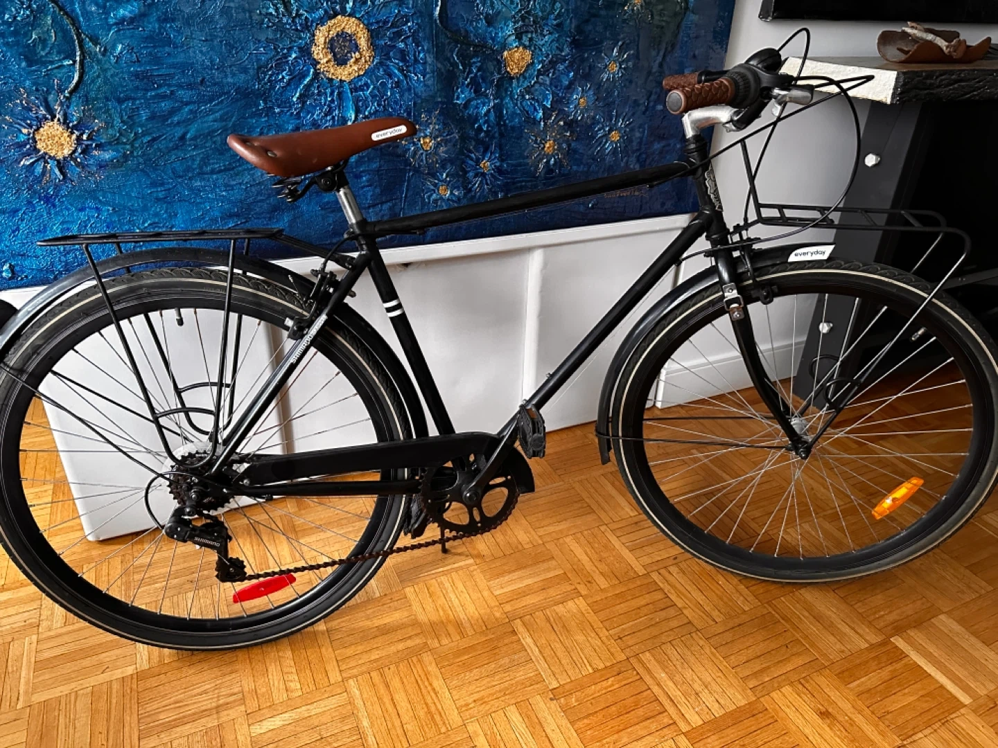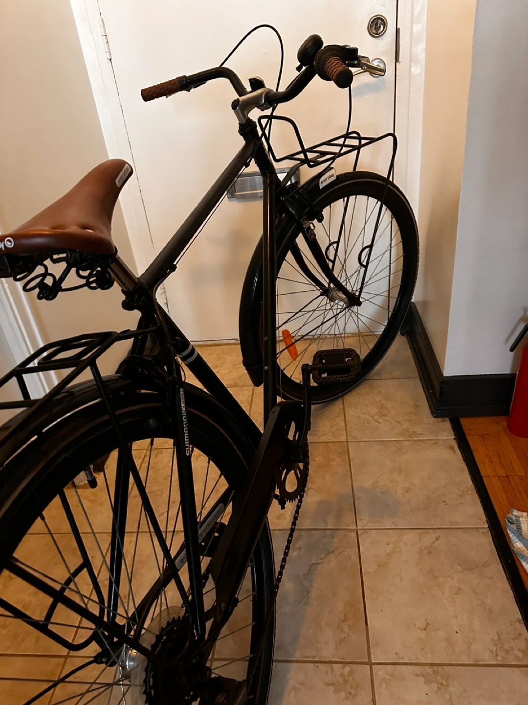 Black commuter bike with front and rear racks. Features Shimano gears and brown grips. It's ready for your daily rides!