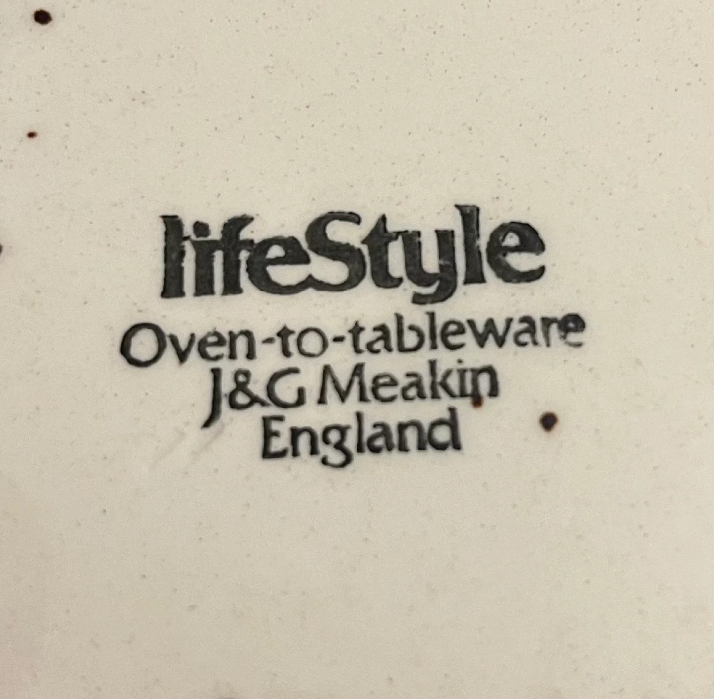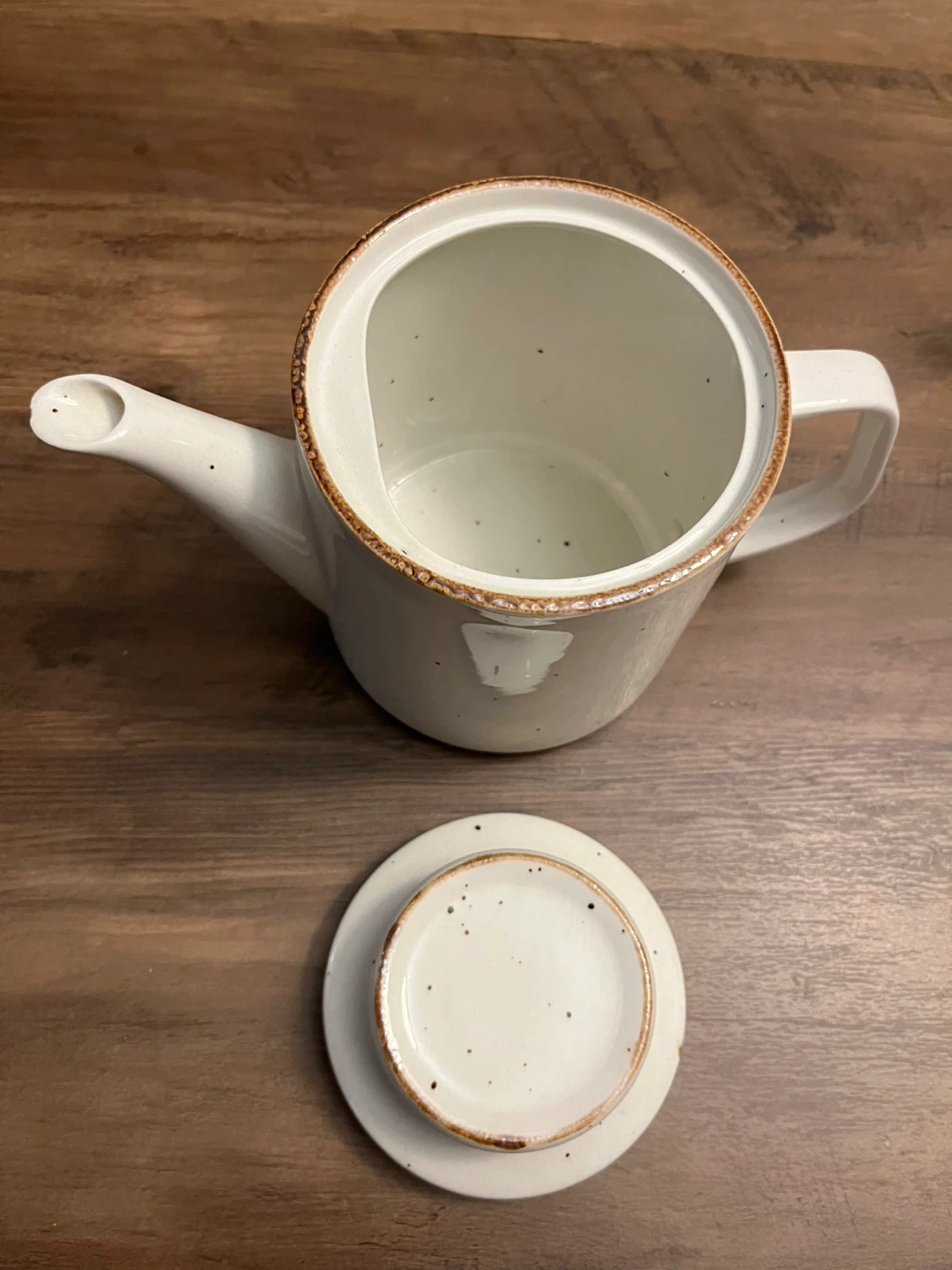 This is a "Lifestyle" teapot from J&G Meakin, made in England. It's oven-to-tableware and features a speckled off-white ceramic design. Great for serving hot beverages!