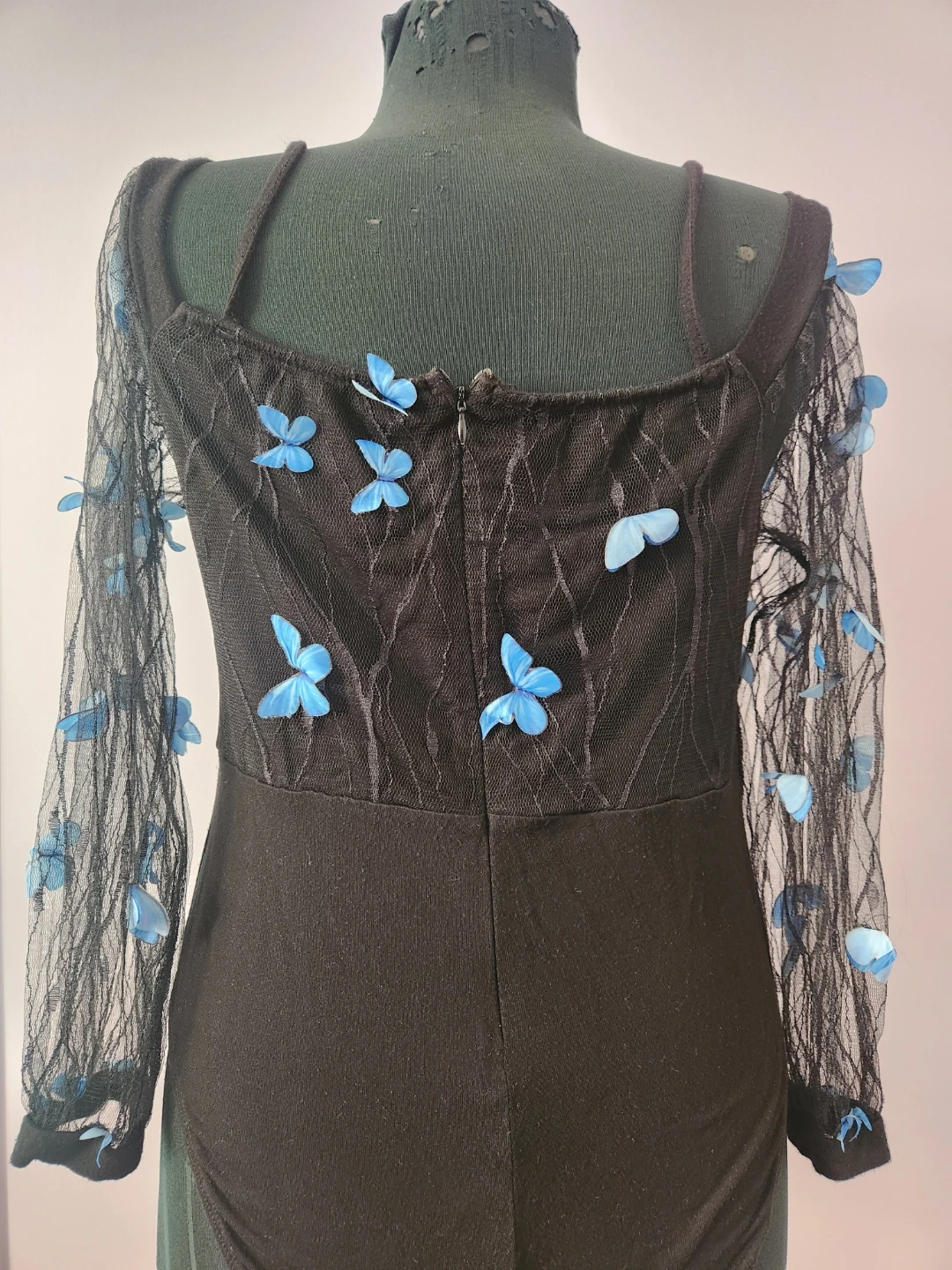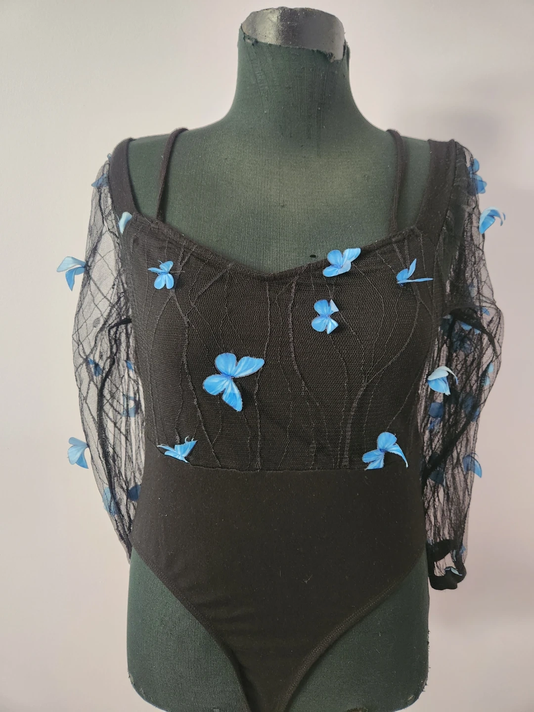 Black sheer mesh bodysuit with delicate blue butterfly appliques on the sleeves and bodice. It has snap closure at the crotch.