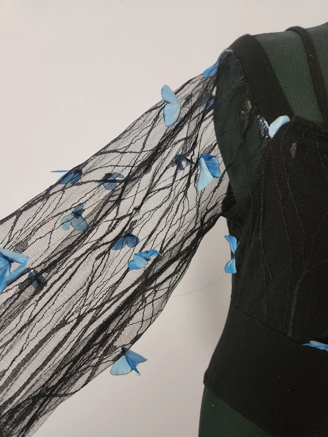 Black sheer mesh bodysuit with delicate blue butterfly appliques on the sleeves and bodice. It has snap closure at the crotch.
