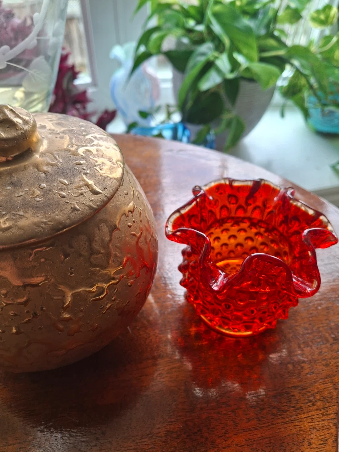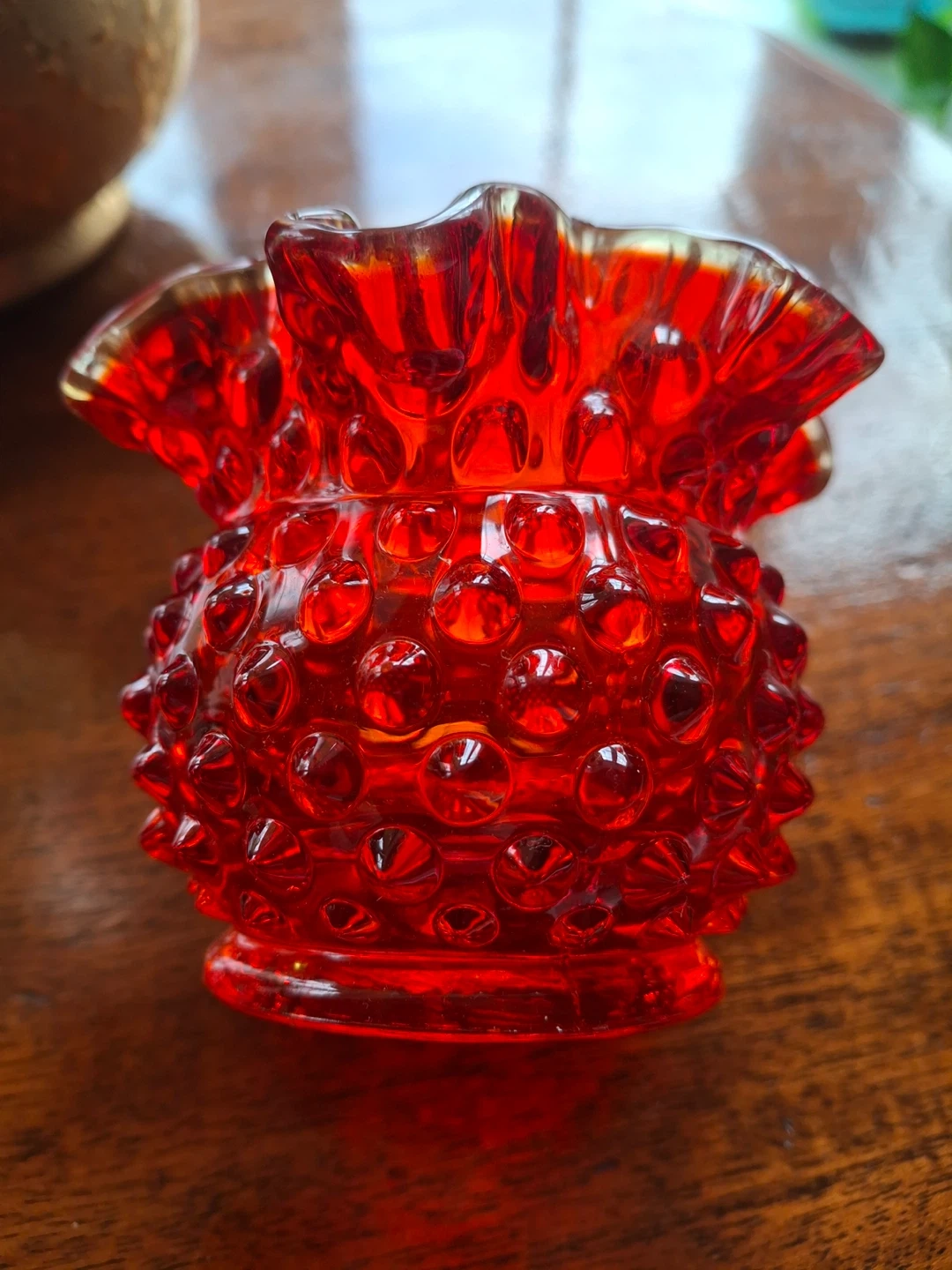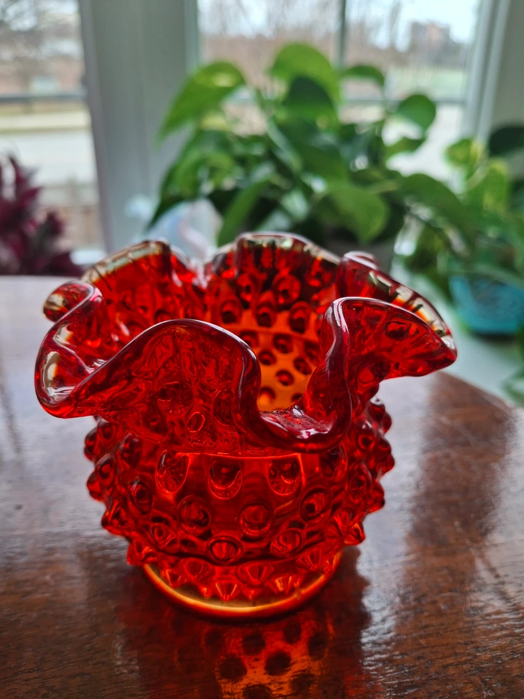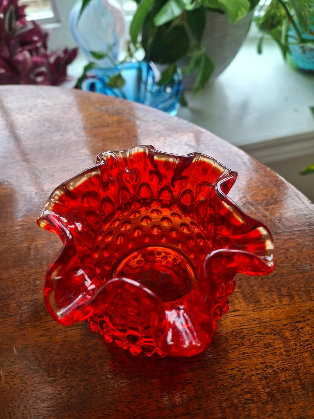 Small vintage Fenton hobnail round ruffled vase/decorative dish. 3” high by 4” wide. Beautiful bright red. Excellent condition.
