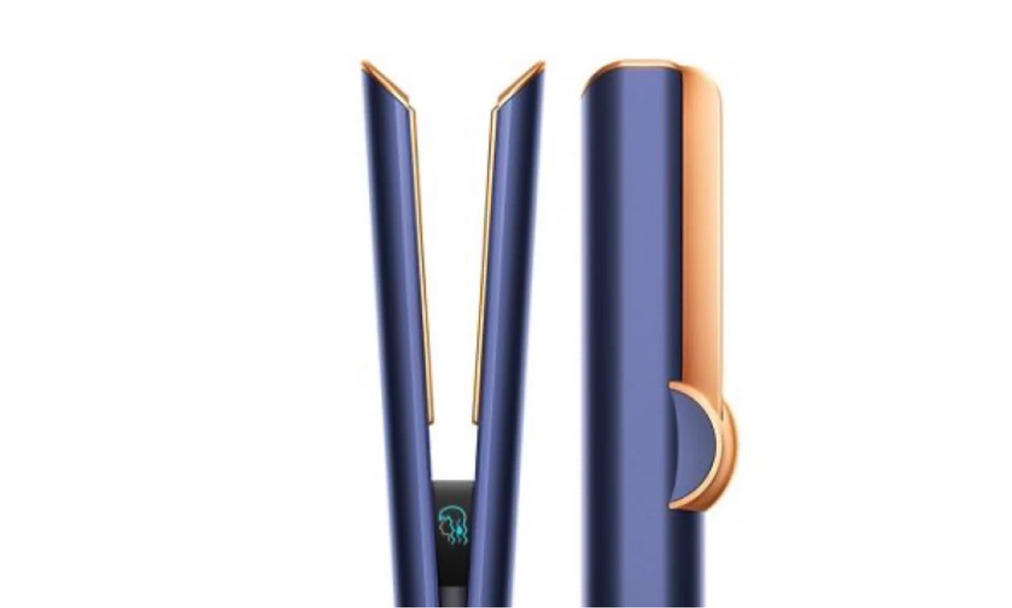 This hair straightener is a deep blue with rose gold accents. It features digital temperature controls and indicator lights. The plates are designed for smooth gliding.