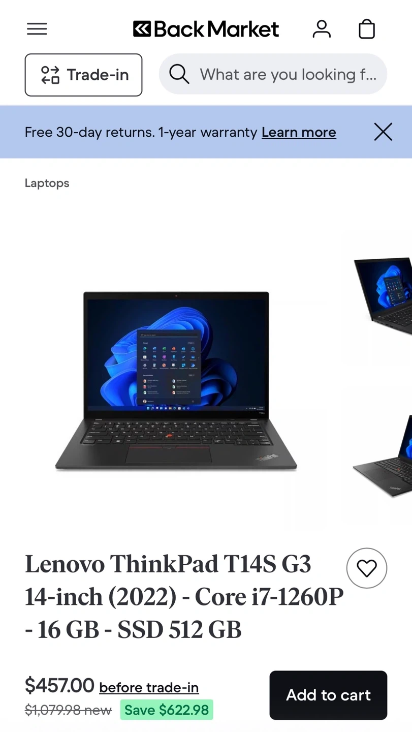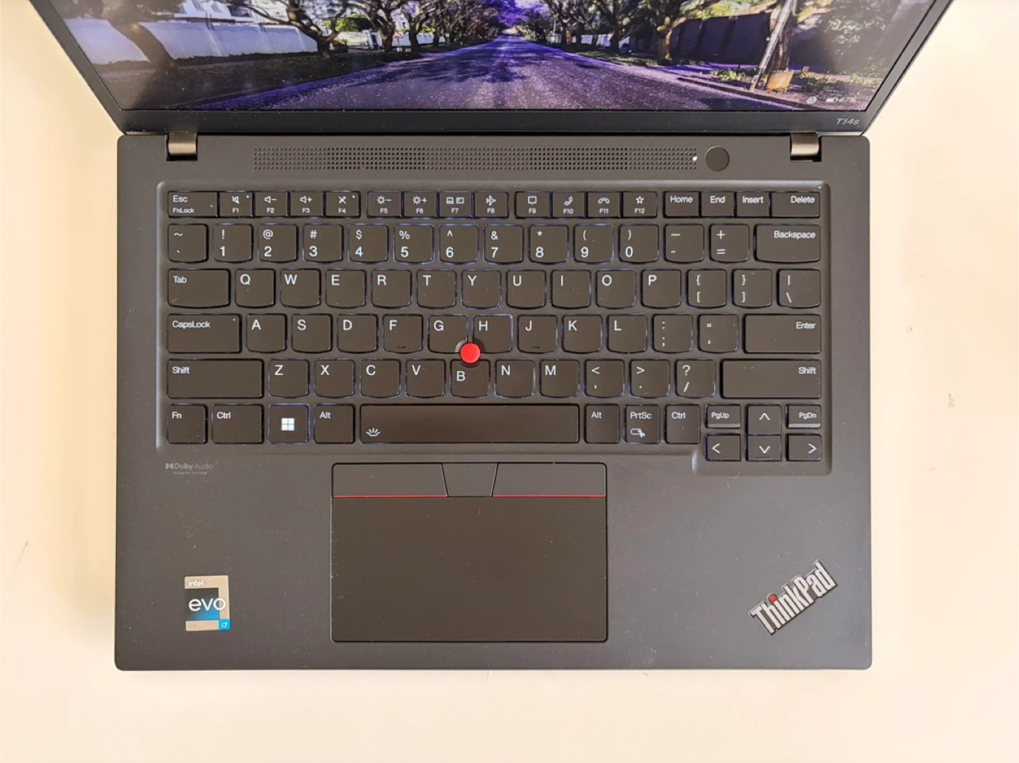 This is a Lenovo ThinkPad T14s gen 3 laptop. It's a sleek and professional machine. It comes with an Intel EVO platform processor and Dolby Audio.