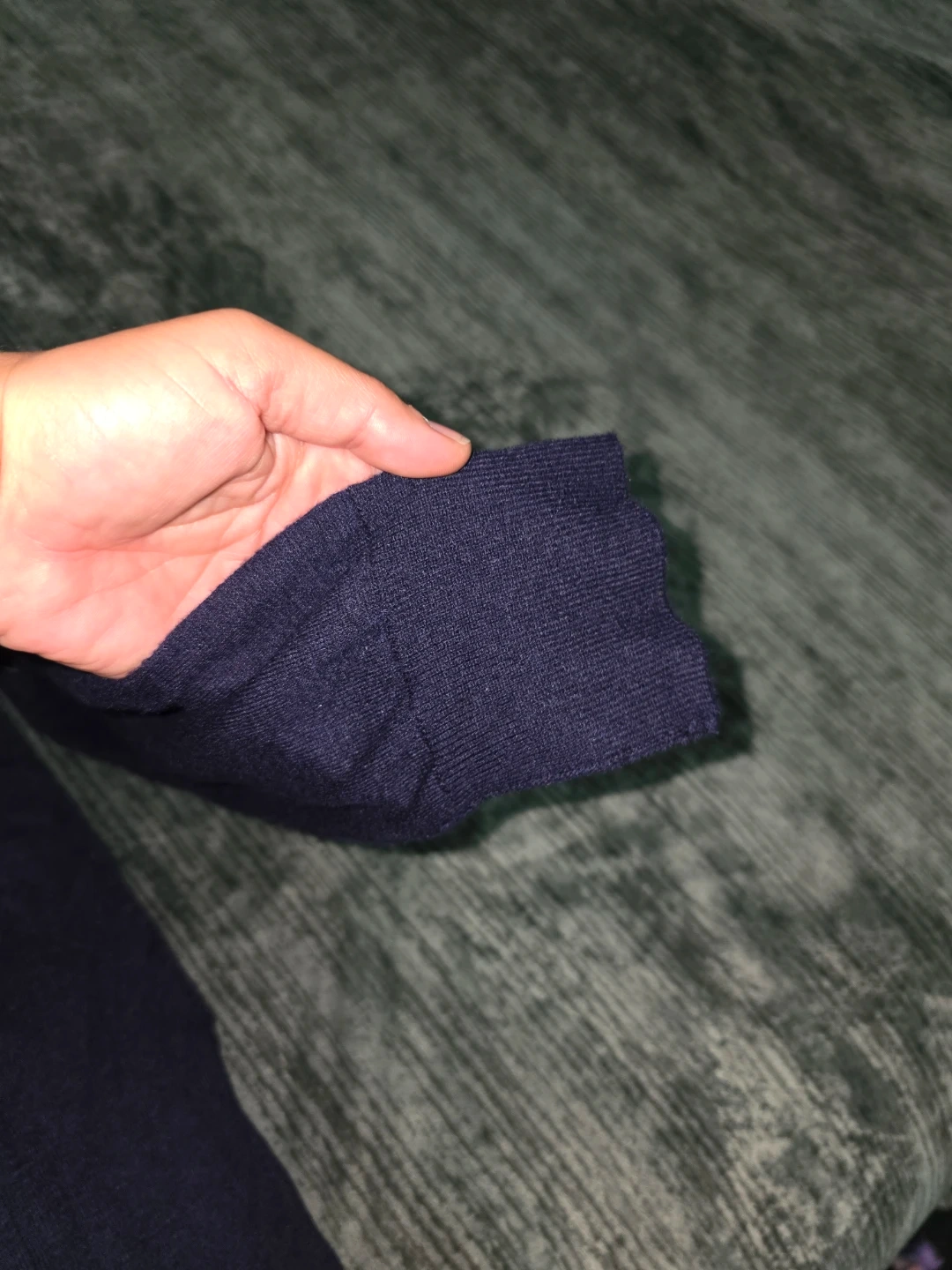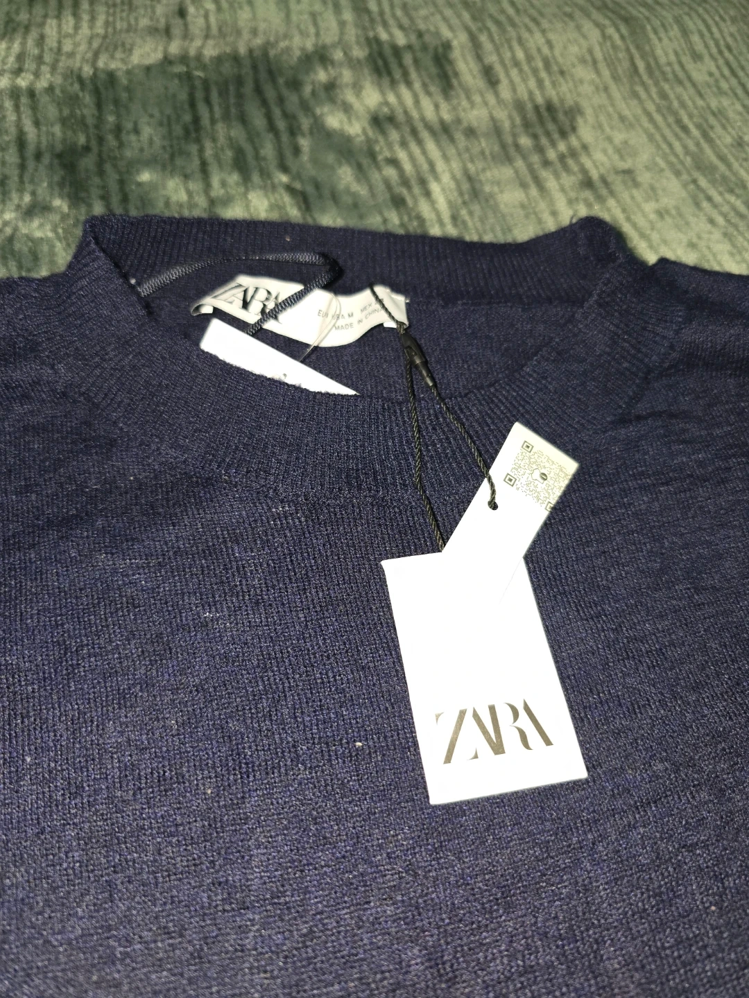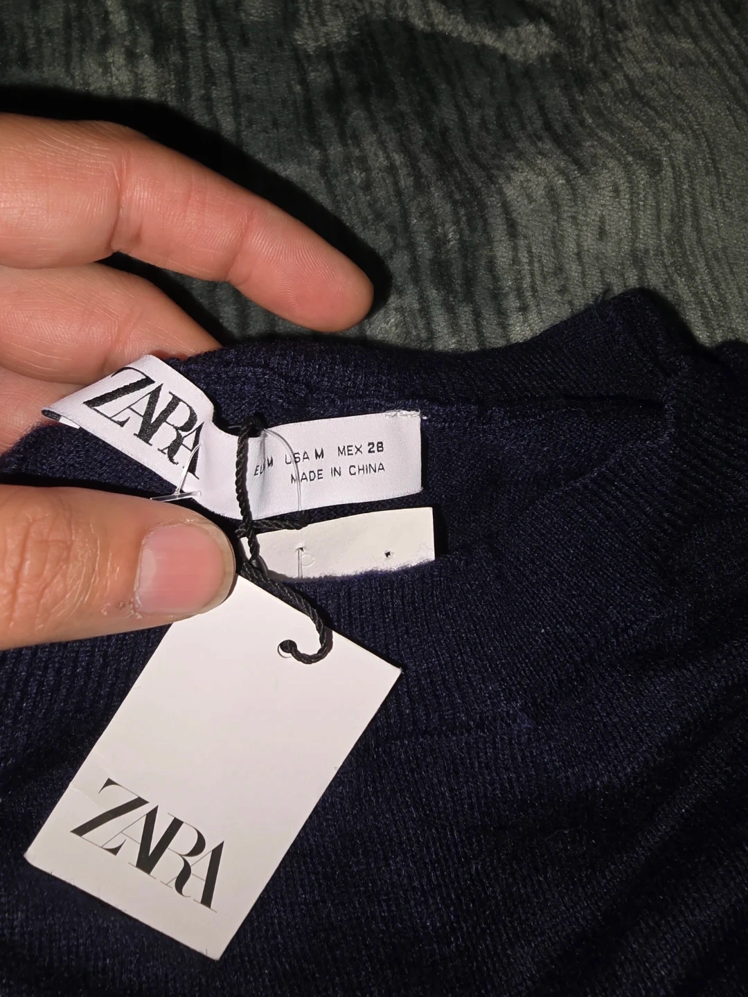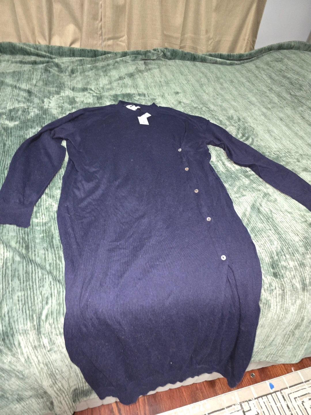 A Zara navy blue long-sleeved cardigan. It's a size medium with button detailing on the side. The material appears to be a knit fabric.