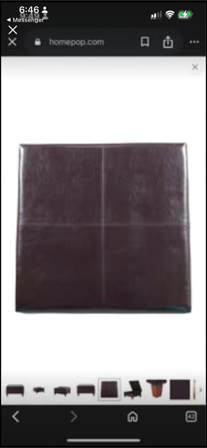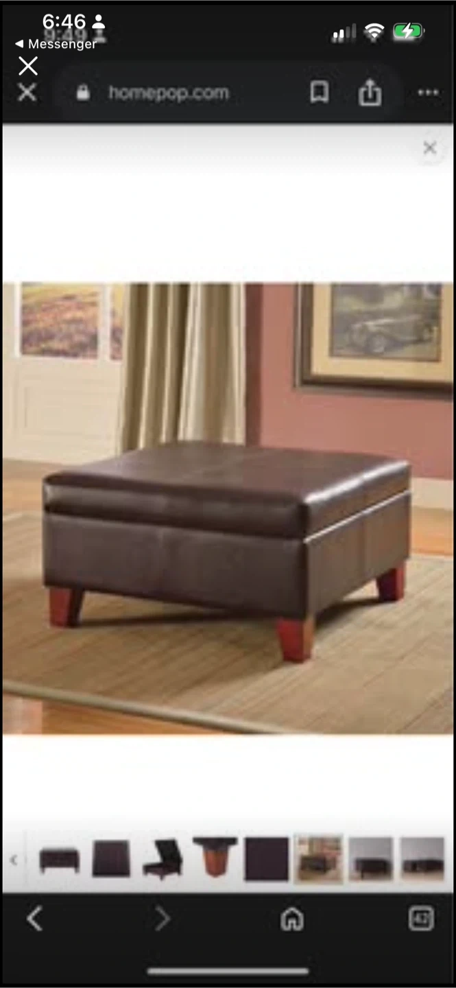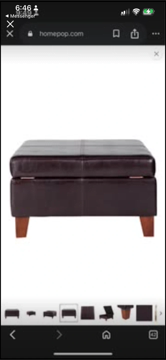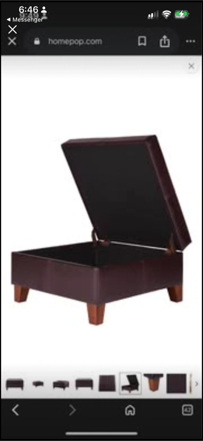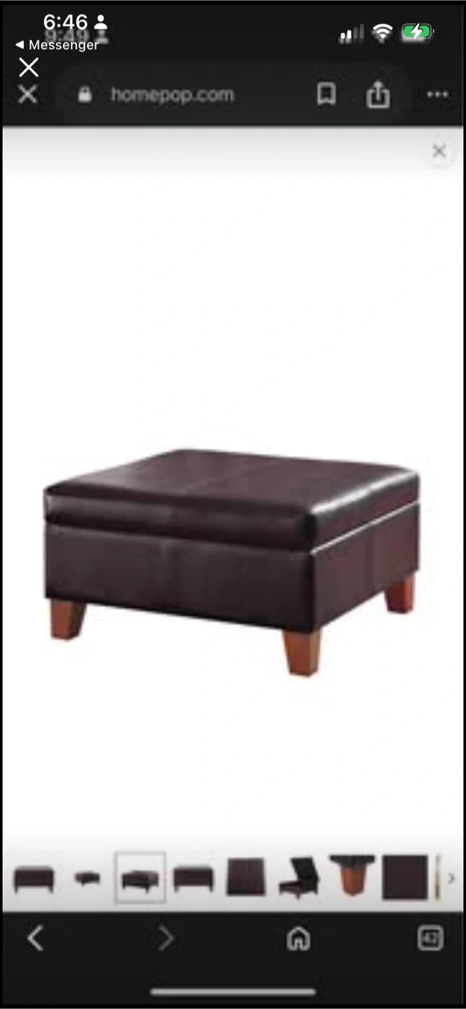 This storage ottoman is upholstered in dark brown faux leather. It's 28" by 28" and 15.75" high. The lid lifts to reveal interior storage space.