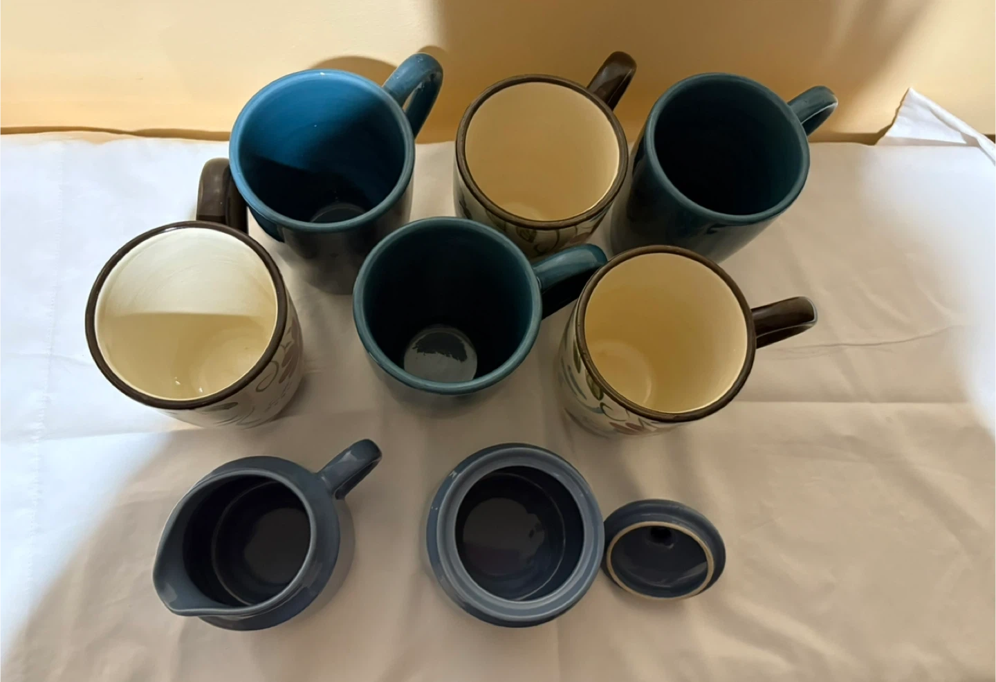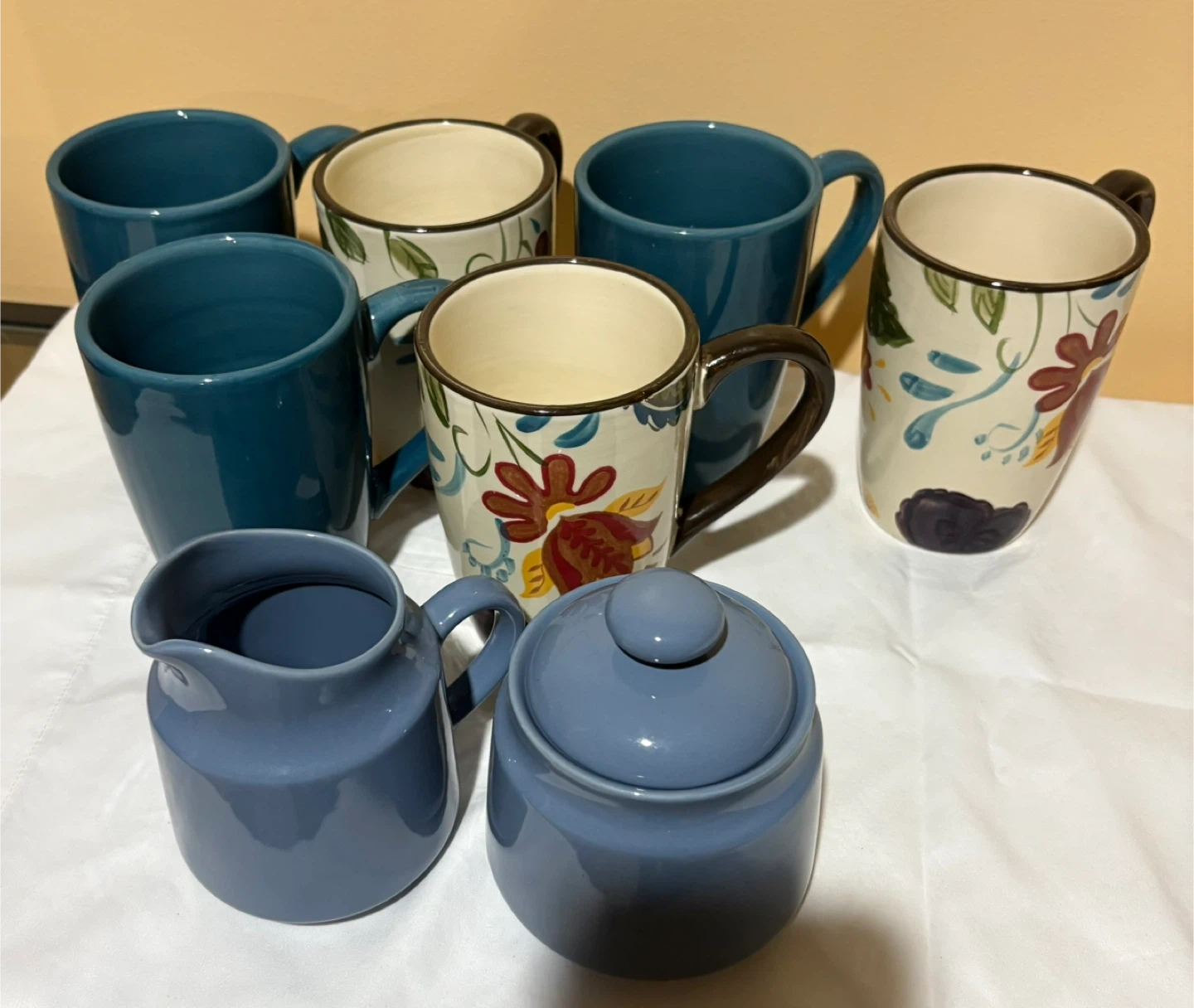 I'm selling a set of mugs from HOME American Simplicity. This set includes 4 solid blue mugs, 2 floral mugs, a creamer, and a sugar bowl with lid. They're in great condition and ready for a new home!
