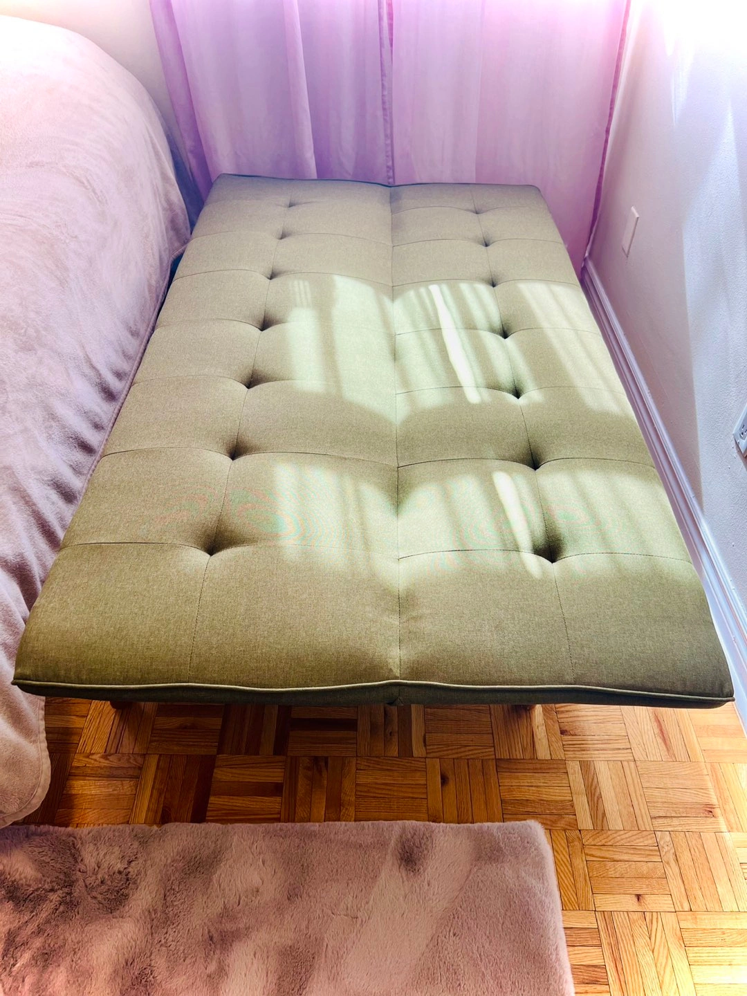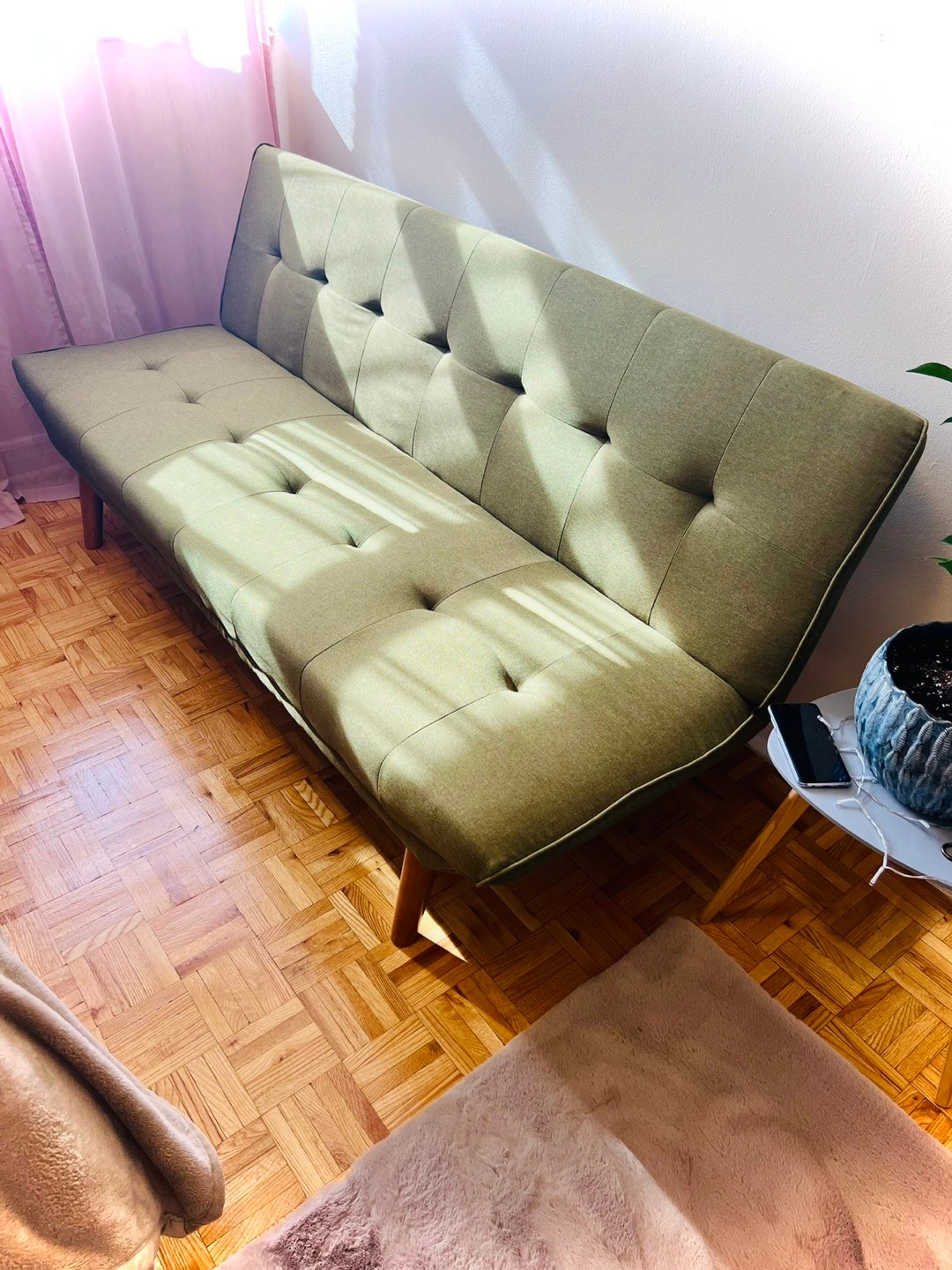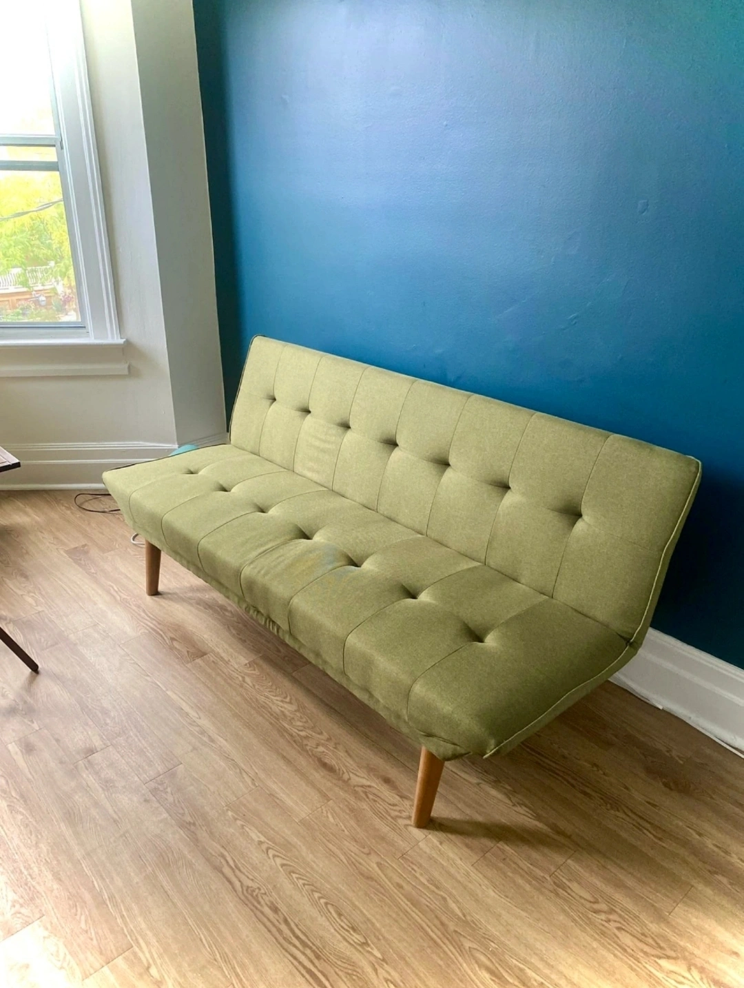 Comfortable futon couch in great condition. It folds out to make a full-sized bed. The color is lovely green. Pick up only (Lansdowne and Davenport). It's in good condition without signs of wear. Please ask any questions you have.