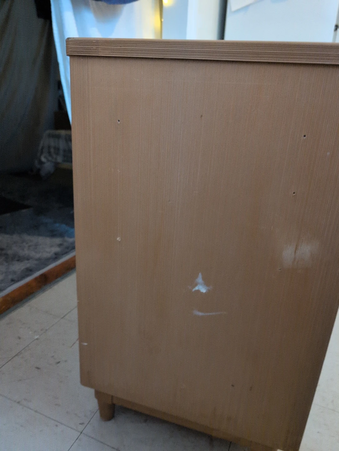 This is a vintage vanity desk with three drawers on the left side. It's made of a light wood laminate material with brass-coloured accents on the drawer fronts. The desk features a simple, functional design. Paint smudge and screw holes on side as shown in photo.