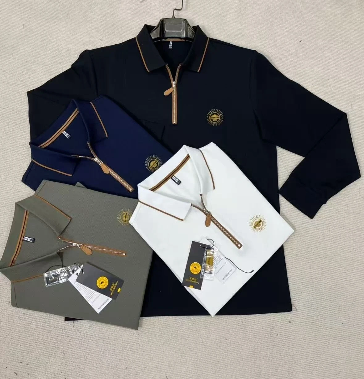 These long sleeve zip polo shirts come in black, navy, grey, and white. They feature a classic collar with brown trim and a zip-up front. The material appears to be a breathable knit fabric.