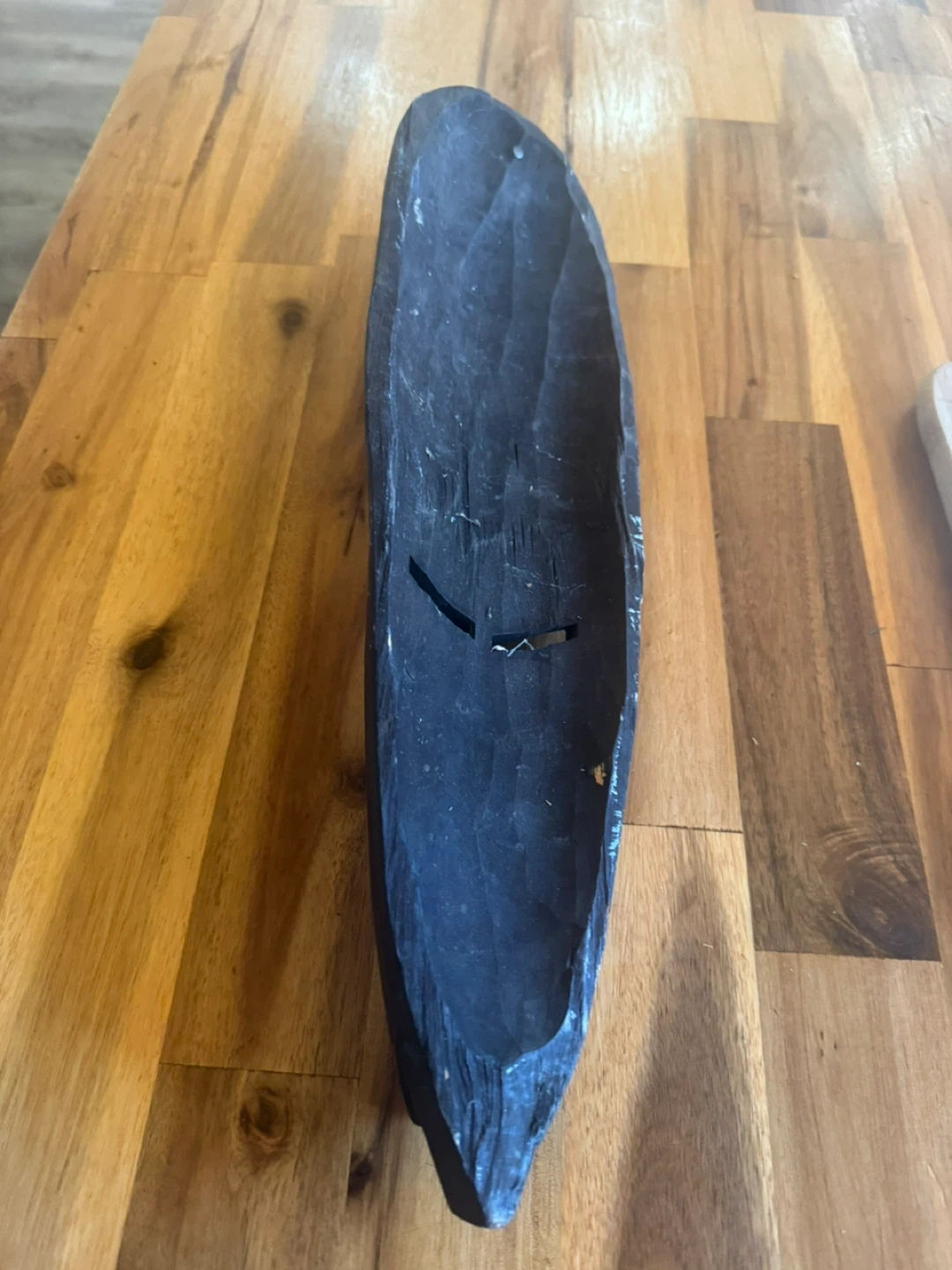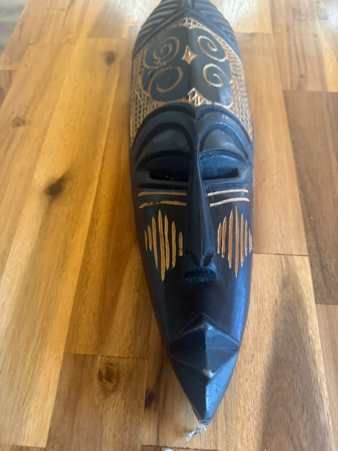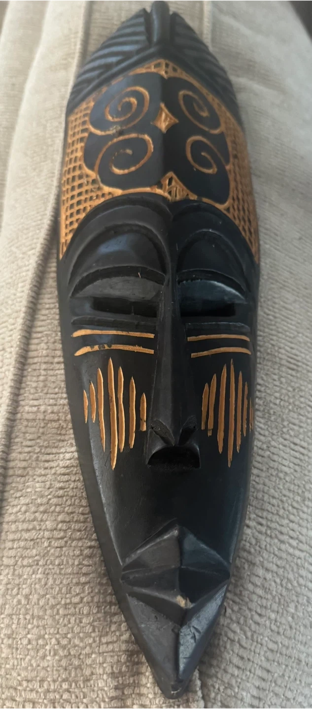 A striking black wooden mask with intricate gold-coloured carvings. It features traditional patterns and a tribal design. This decorative piece would make a great addition to home decor.