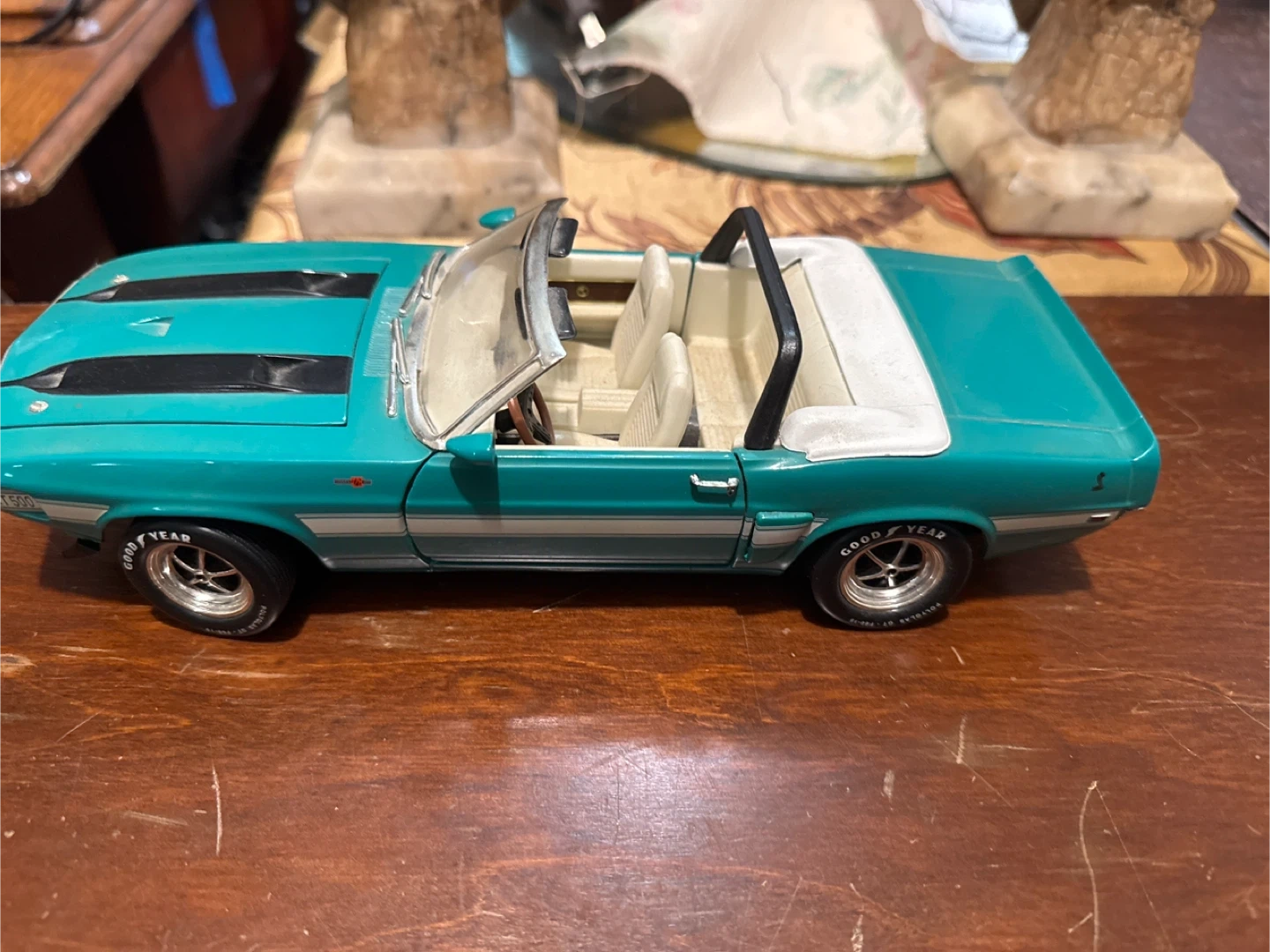 This is a green model convertible car with black racing stripes and white interior. It features detailed Goodyear tires and a white convertible top. It's a collectible item for car enthusiasts.