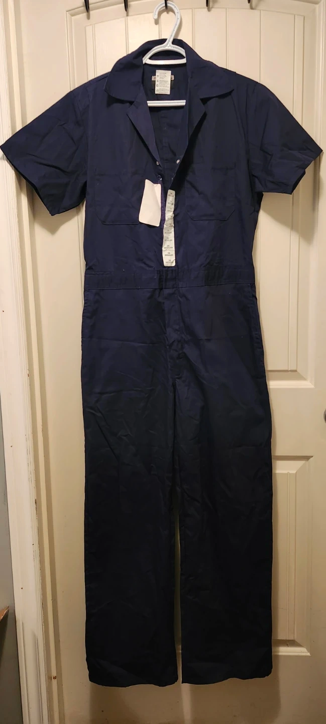 This navy blue short sleeve jumpsuit is built for durability. It features a comfortable fit suitable for a variety of work environments. These coveralls are a practical choice for keeping your clothes clean and protected.