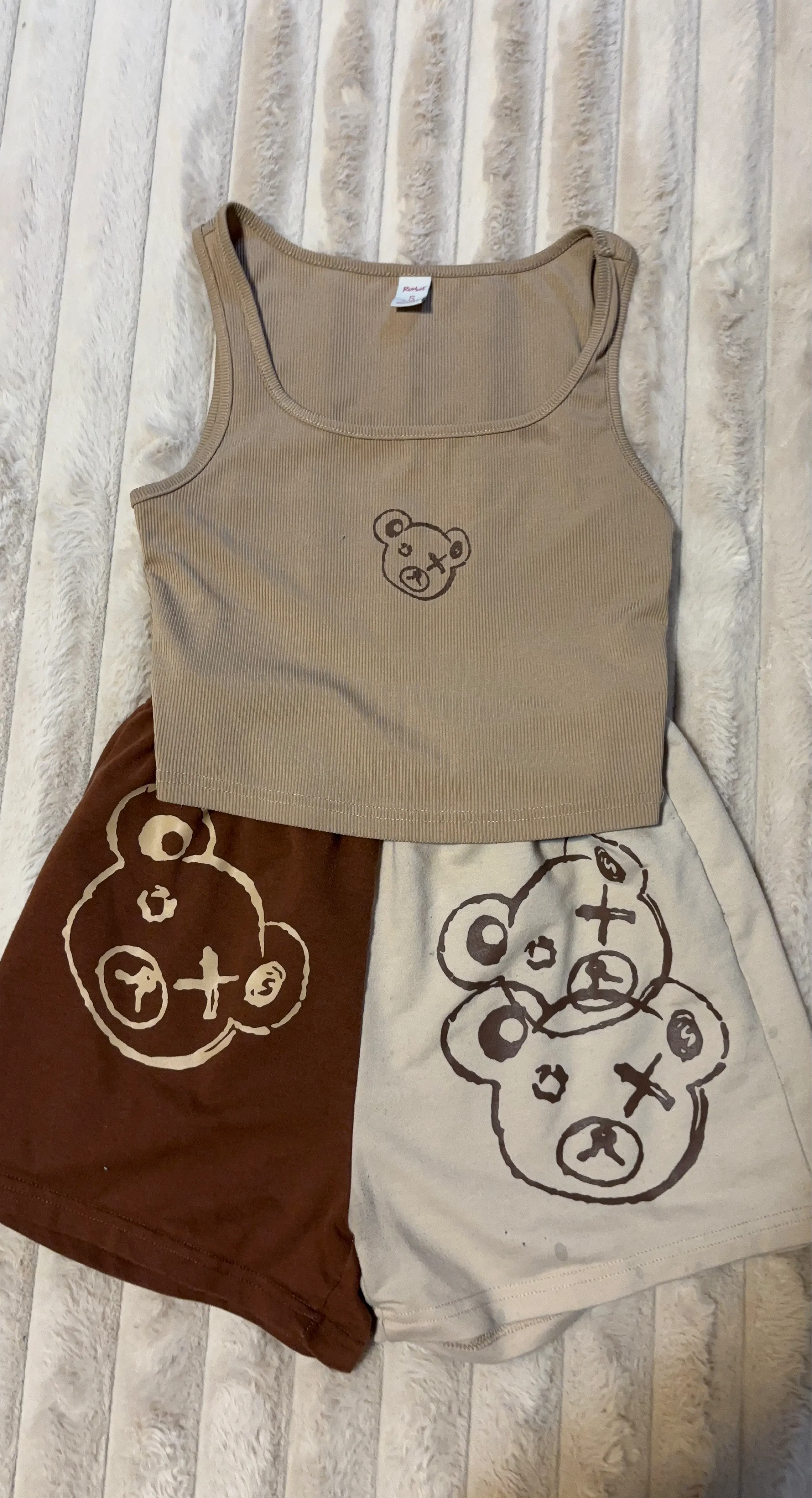 Ribbed tank top with a cute bear graphic, paired with matching shorts. This set features a beige tank and two-toned shorts in brown and beige. Perfect for casual wear or lounging!