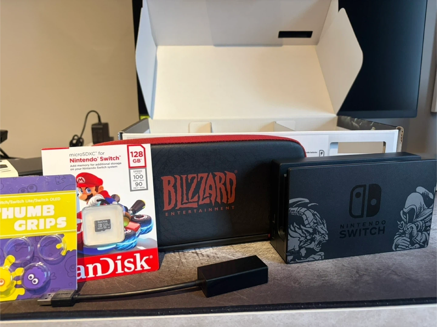 Selling this as I mostly game on PC now 🙂 As you can see from the pictures this is like mint and new with all original packaging. A few facts~ * I’m the original Owner * It has had a screen protector installed since day 1 * It’s been properly factory reset and delinked from Nintendo and ready for new owner * I’m including an official 128gb SD card * I’m including a Ethernet adapter if you wish to hardwire * I’m including some splatoon grips Disclaimer : This will not come with the game as the code was redeemed. Any other questions please reach out.