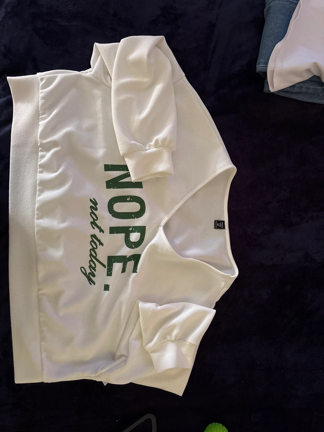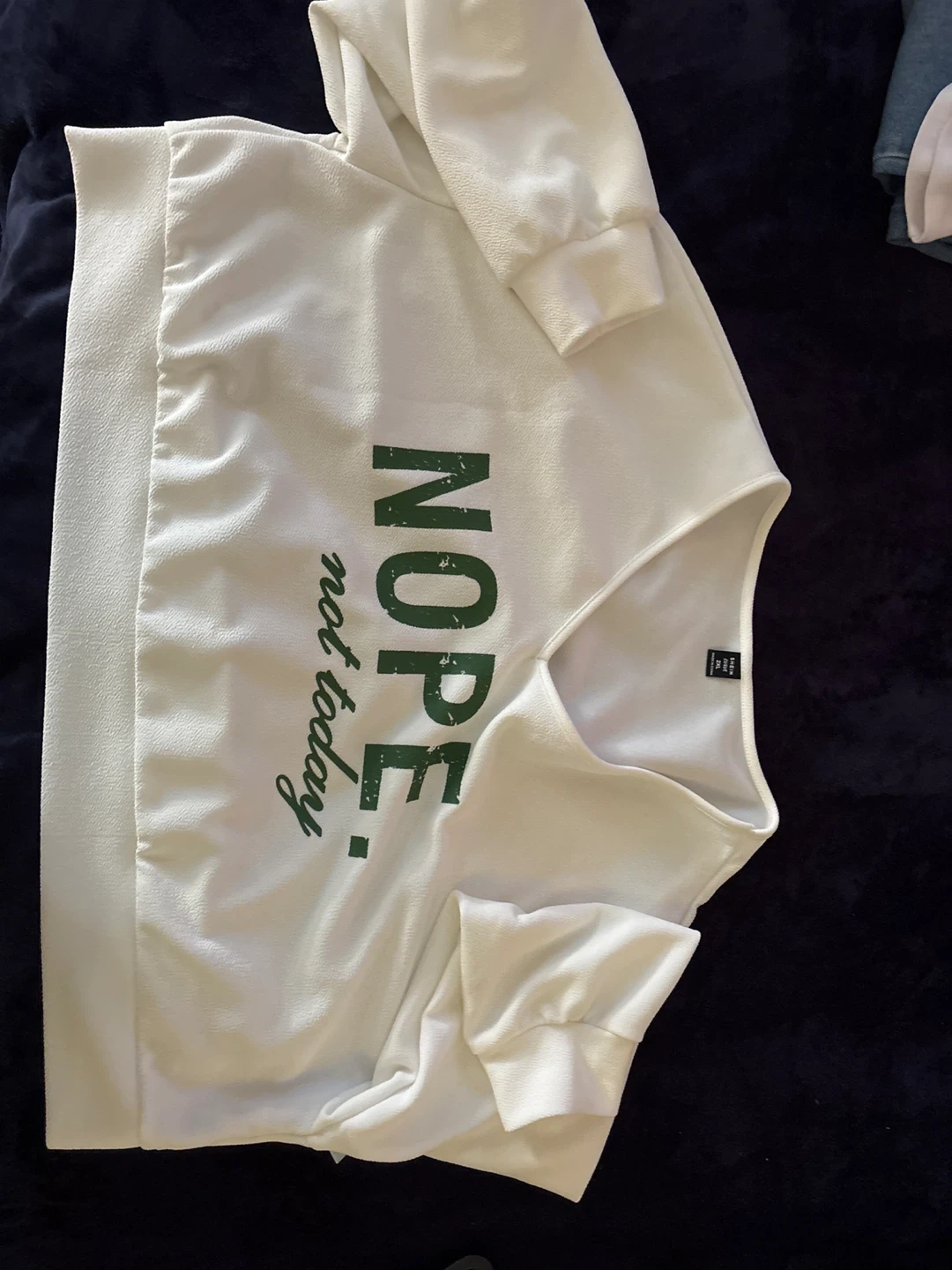 This white SHEIN CURVE sweatshirt features a "Nope not today" graphic print in green. It's a size 2XL with a V-neckline and long sleeves. The fabric has a textured finish.
