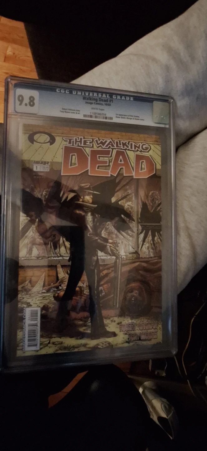 The Walking Dead #1 comic book, graded 9.8 by CGC. This issue features the first appearance of Rick Grimes, Shane Walsh, Morgan & Duane Jones. Published by Image Comics in 10/03.