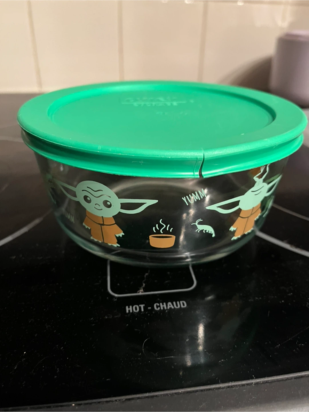 Selling a Pyrex storage bowl featuring a cute Baby Yoda design! It comes with a green lid. It's perfect for storing leftovers or packing a snack