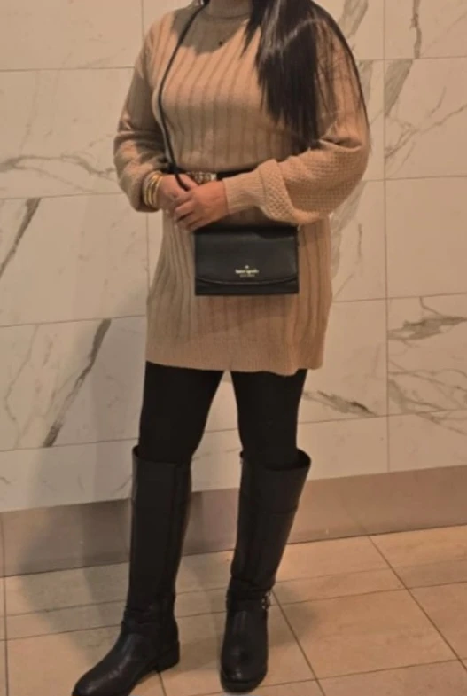Cozy turtleneck sweater dress with ribbed detailing. Features textured balloon sleeves. It's made of a soft knit material. Perfect for cooler weather!
