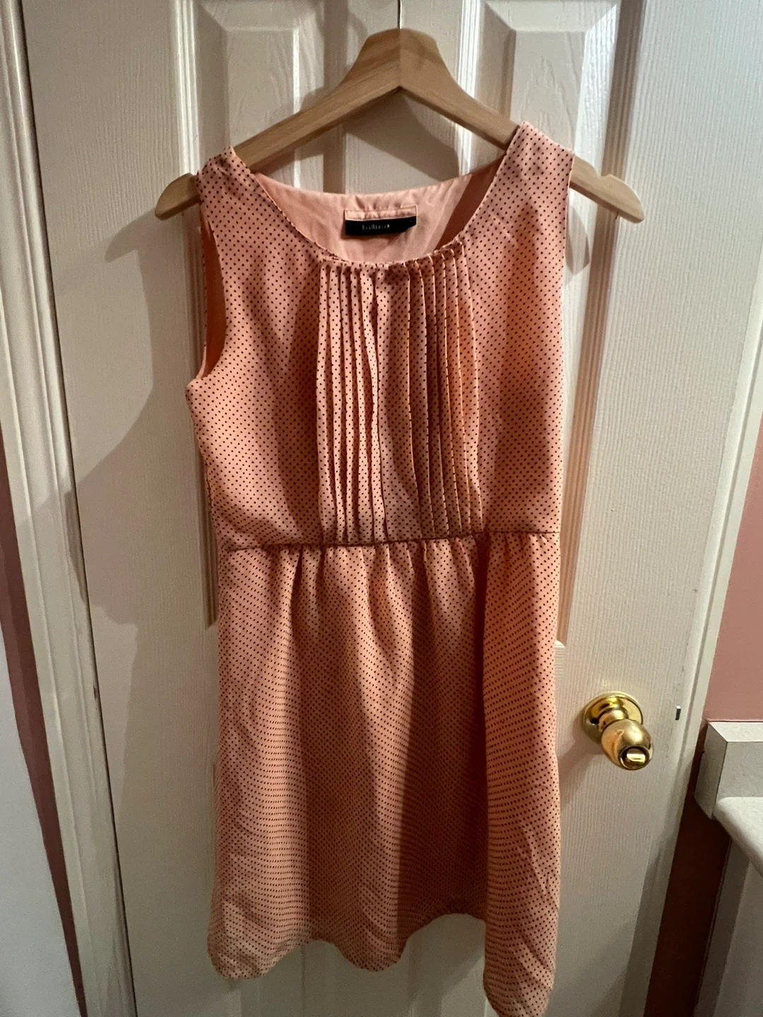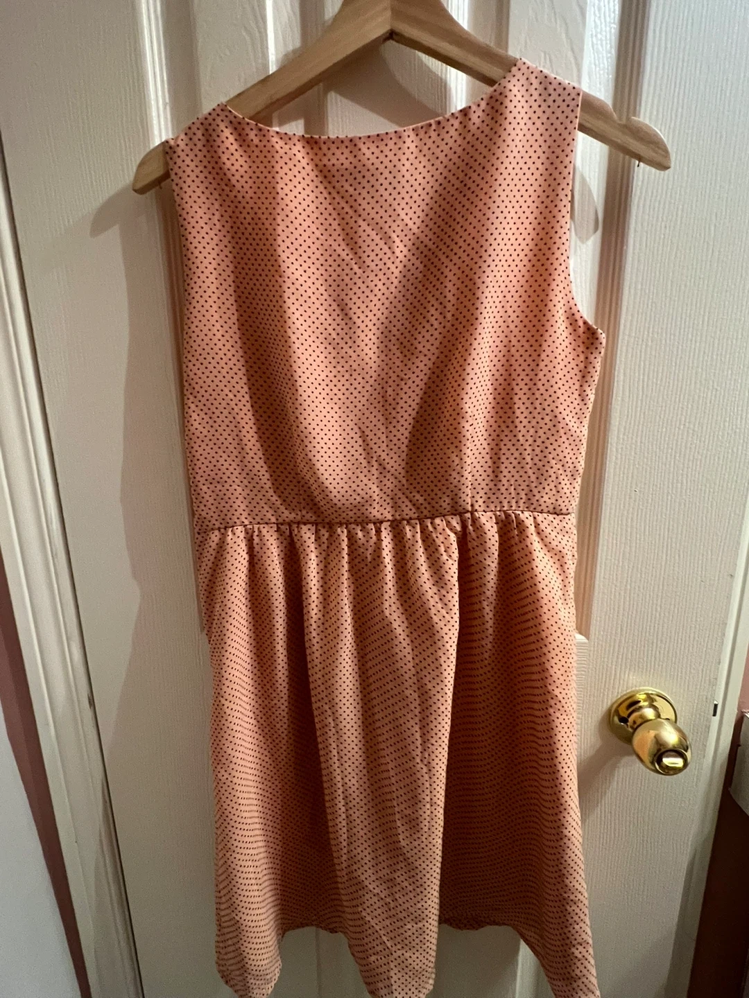 This is a cute sleeveless dress with a pink and black polka dot pattern. It features a gathered waist and delicate pleats at the neckline. Made from a lightweight fabric, it's perfect for warmer weather.
