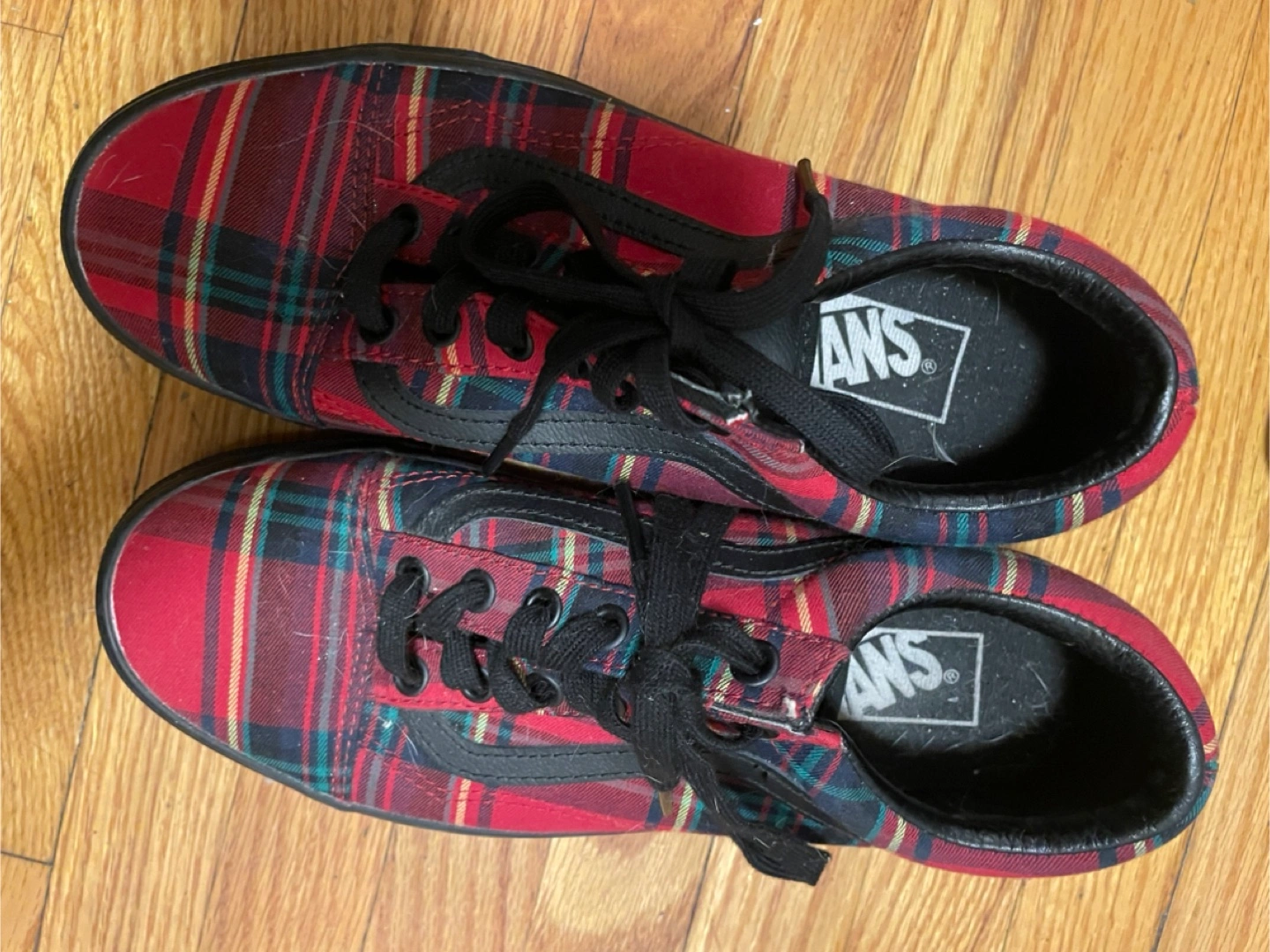 Selling a pair of Vans Old Skool sneakers in a cool plaid pattern! They have black laces and the classic Vans logo. These are in good used condition and ready for a new home