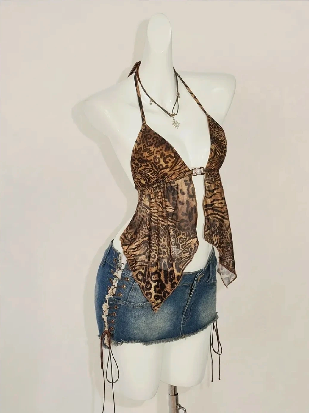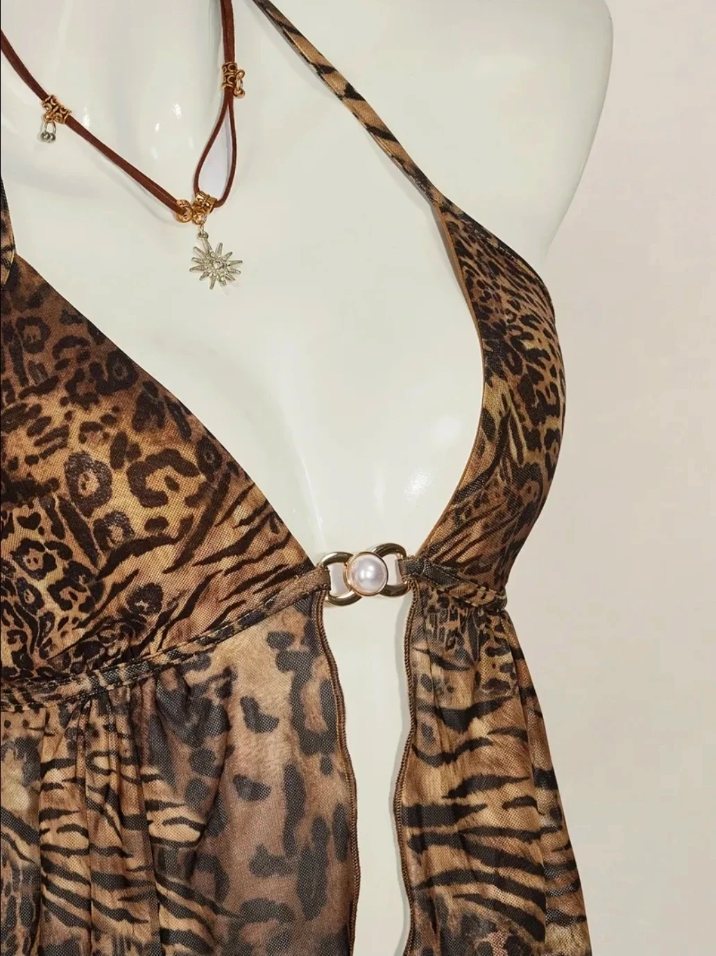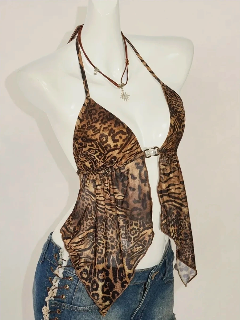 Turn heads with this stunning leopard print halter top, perfect for a bold night out or a trendy festival look. It features a unique mix of animal prints on a lightweight, flowy fabric with a flattering handkerchief hemline. The center front is detailed with a chic faux pearl connector, adding a touch of vintage-inspired glam.