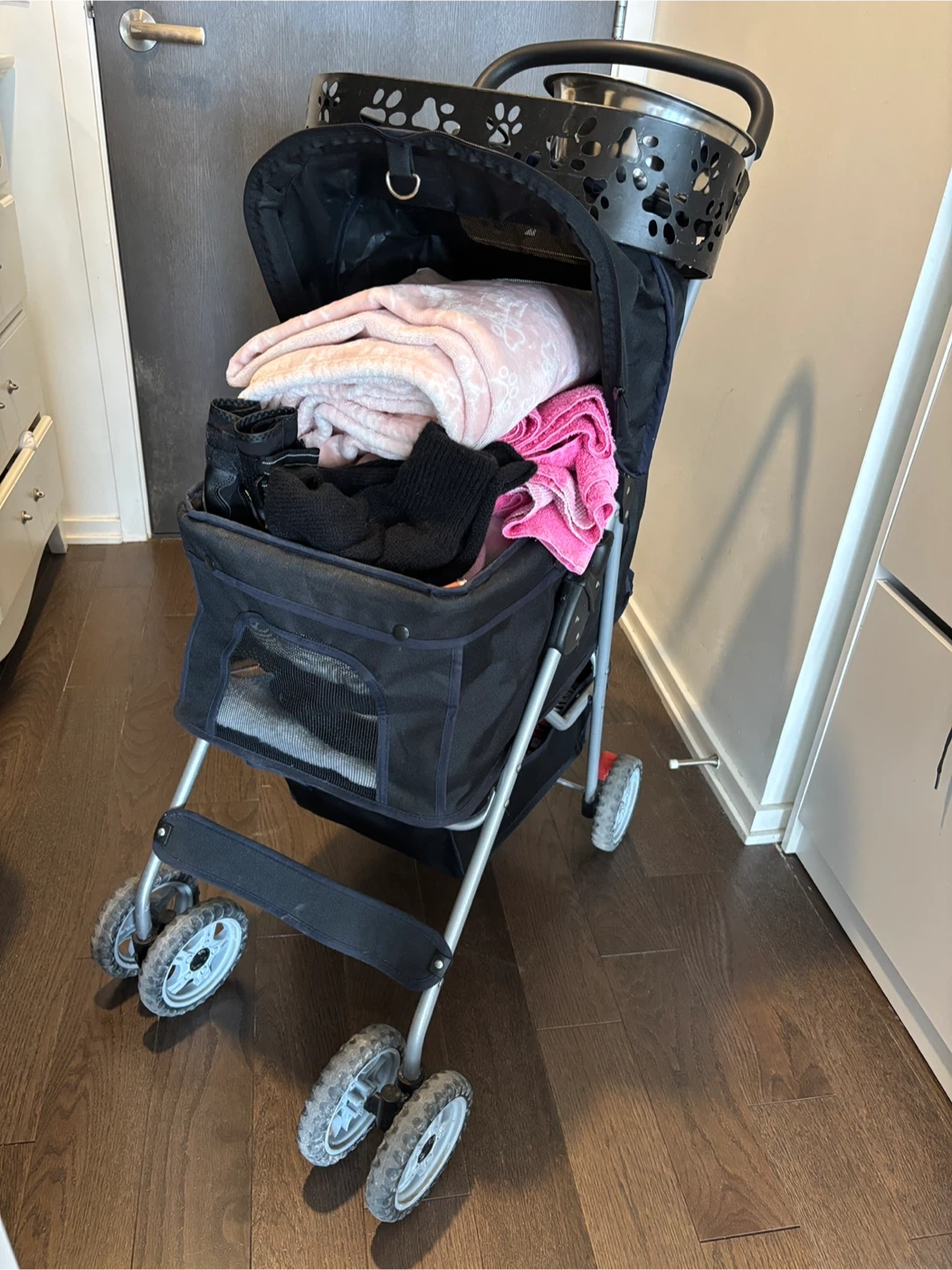 I’ve packed up this pet stroller full of basic necessities for a dog.
