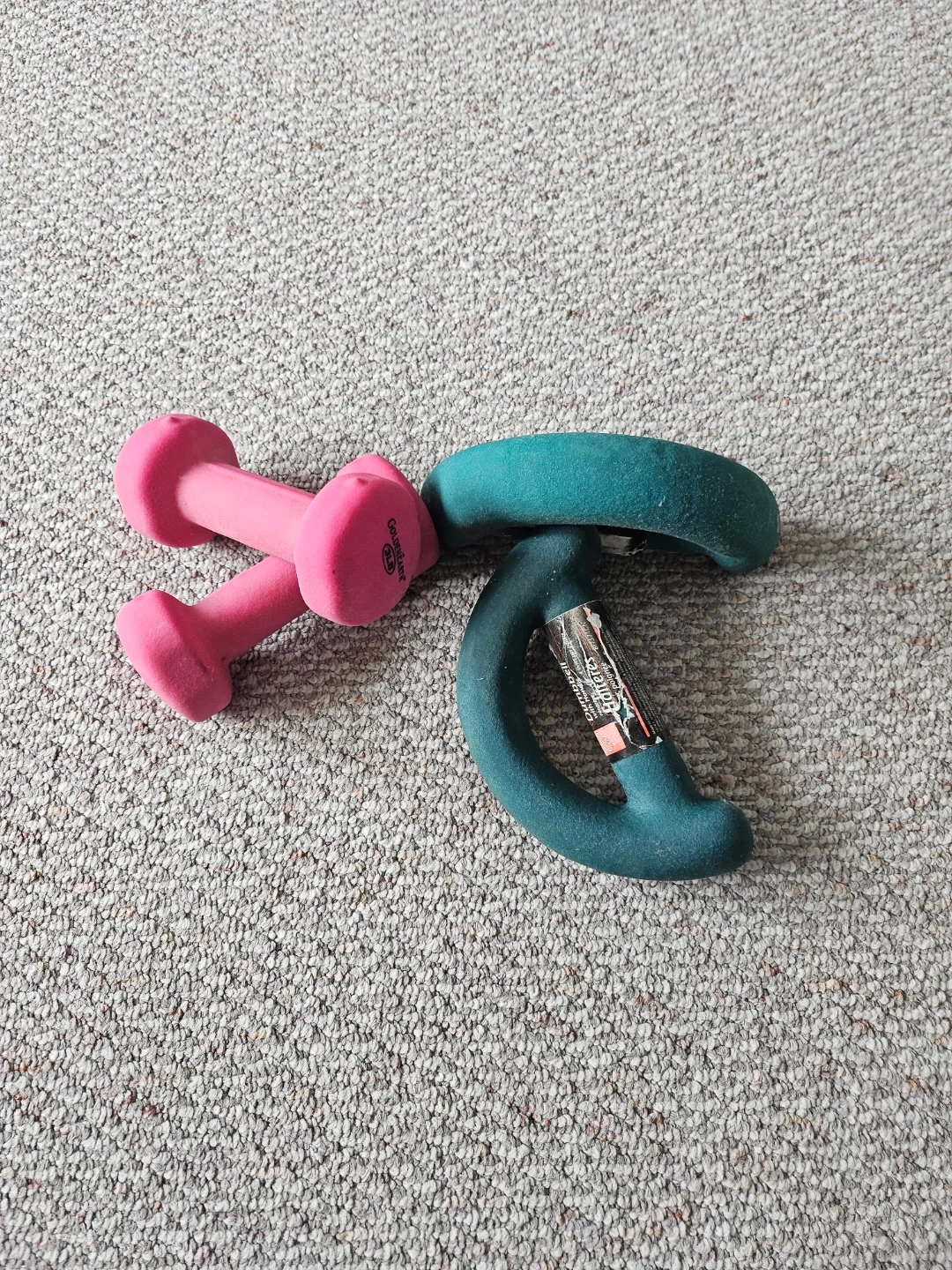 Two neoprene-covered dumbbells, one set is pink and the other is teal. The pink dumbbells are 3 lbs each, and the teal dumbbell is 5 lbs. They're great for home workouts!