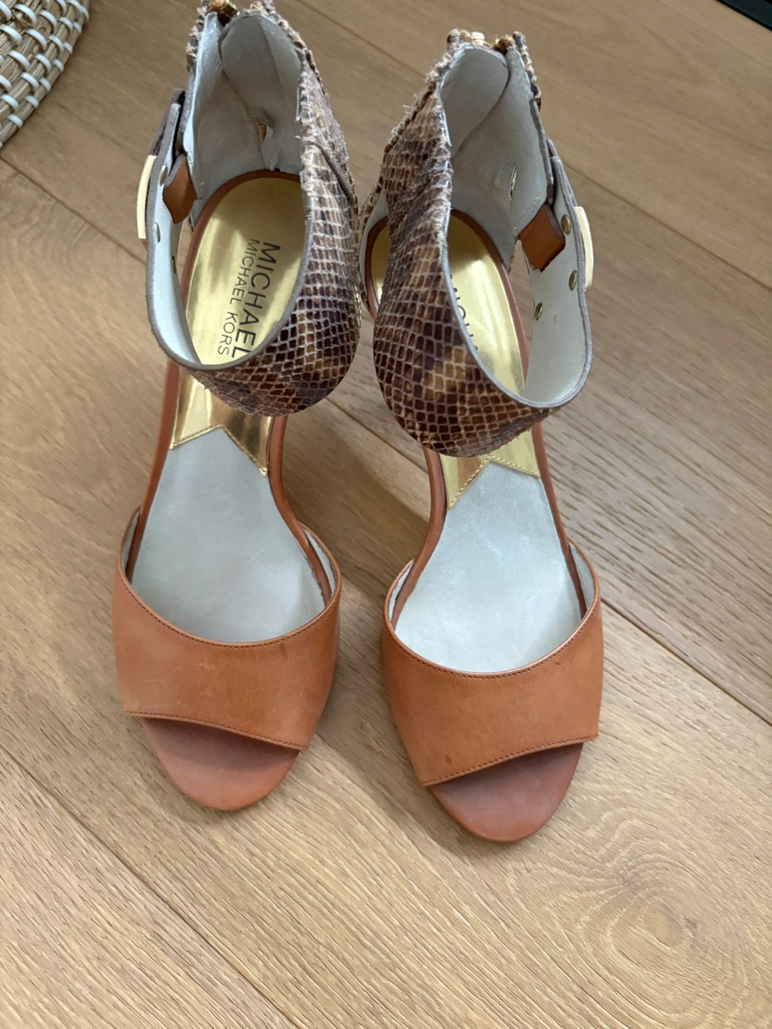 Beautiful Michael Kors heels. Tan leather and snakeskin upper. Ankle strap closure. Stiletto heel. Zip closure at back. Size 7. Worn twice and now doesn’t fit postpartum