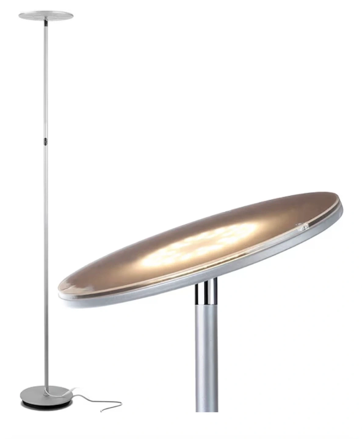A sleek, modern LED floor lamp with a brushed silver finish. Its slim design makes it a great addition to any living space. The lamp provides bright, even illumination.