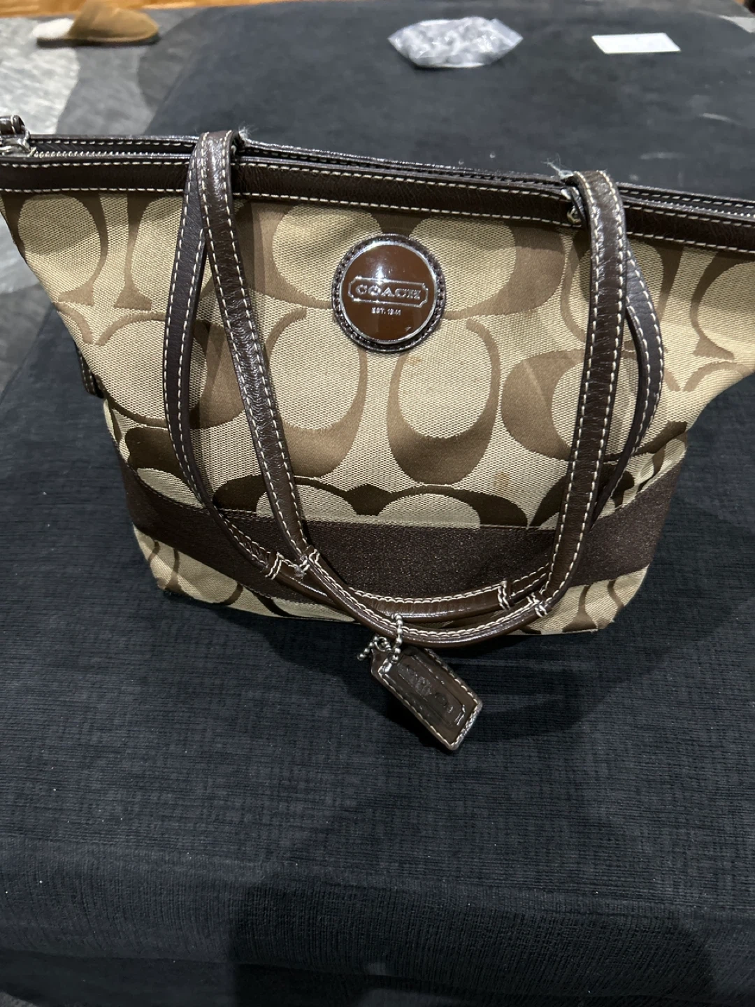 Coach canvas tote bag with signature monogram pattern. It features leather trim and straps. This stylish bag is perfect for everyday use.