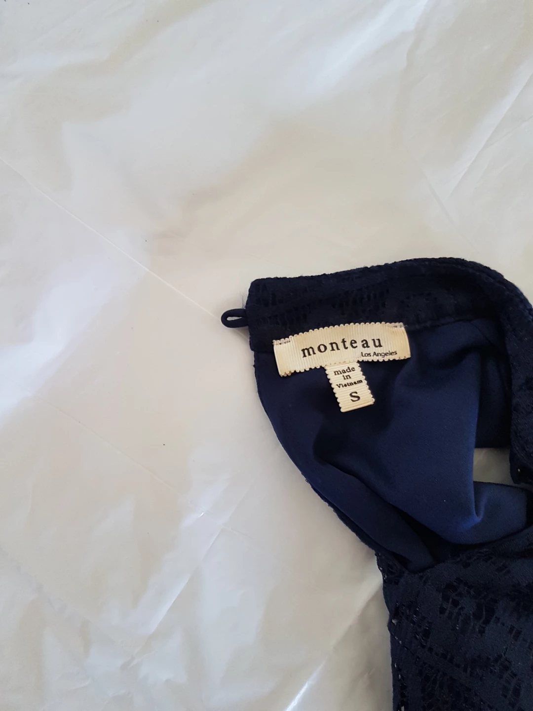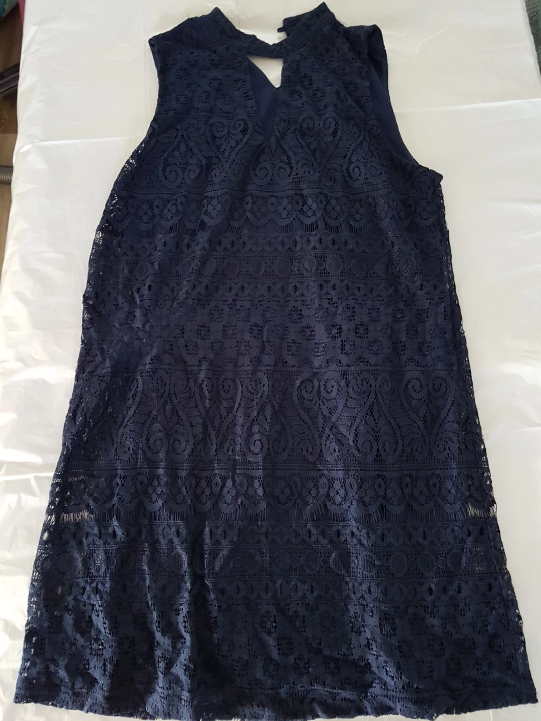 This navy lace dress is from Monteau. It's a size small and sleeveless with a high neckline. The intricate lace pattern makes it a lovely choice for various occasions.