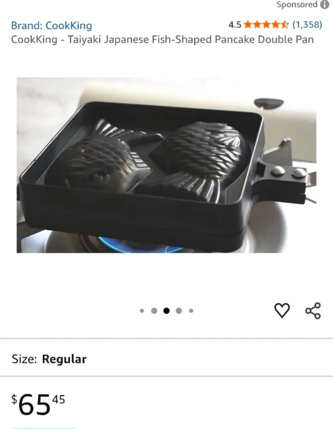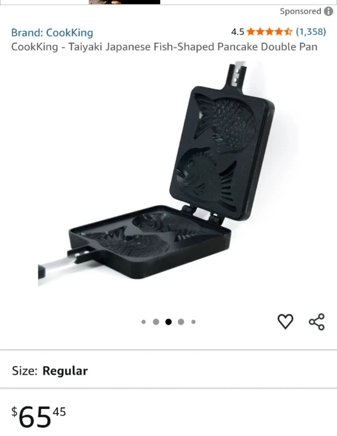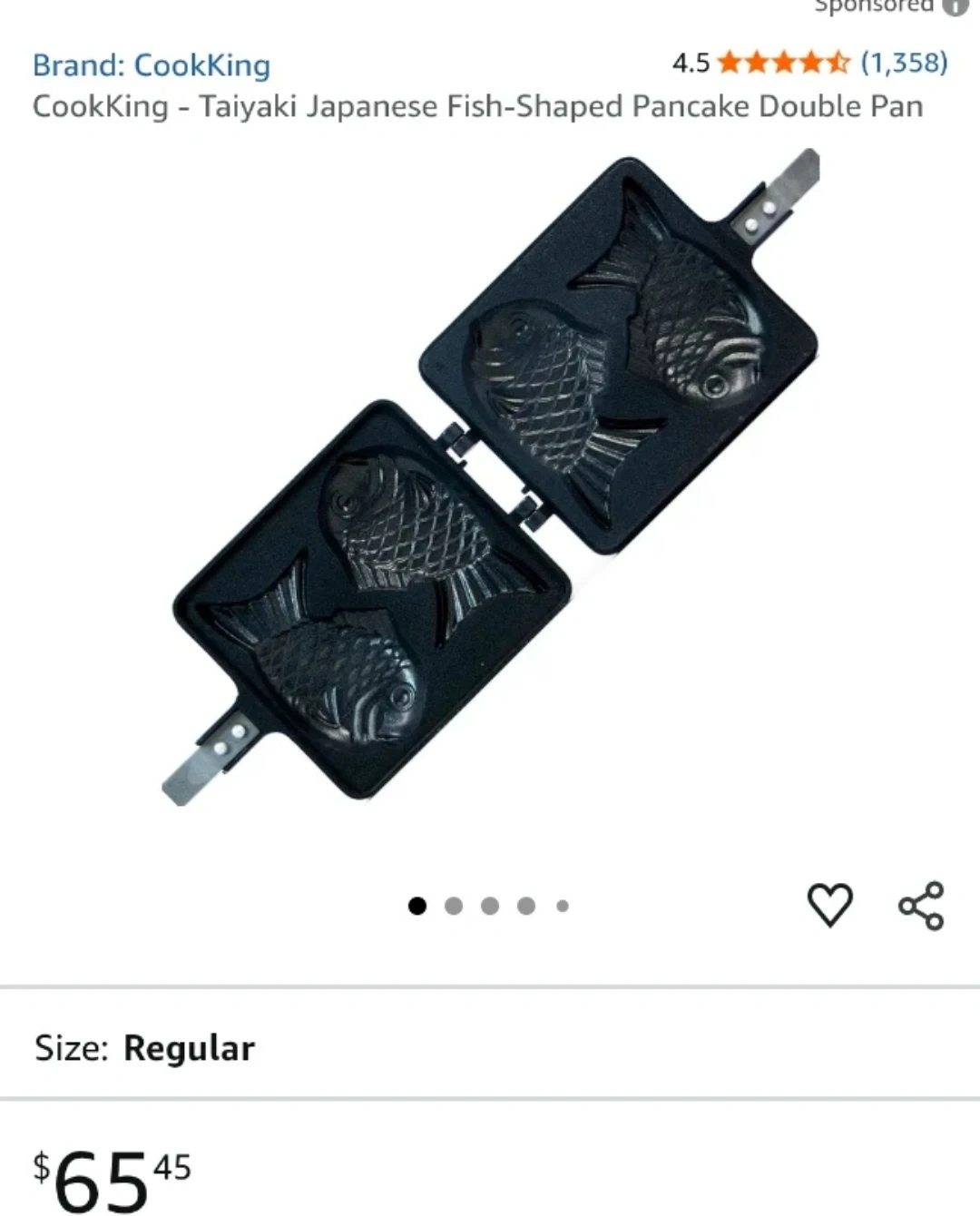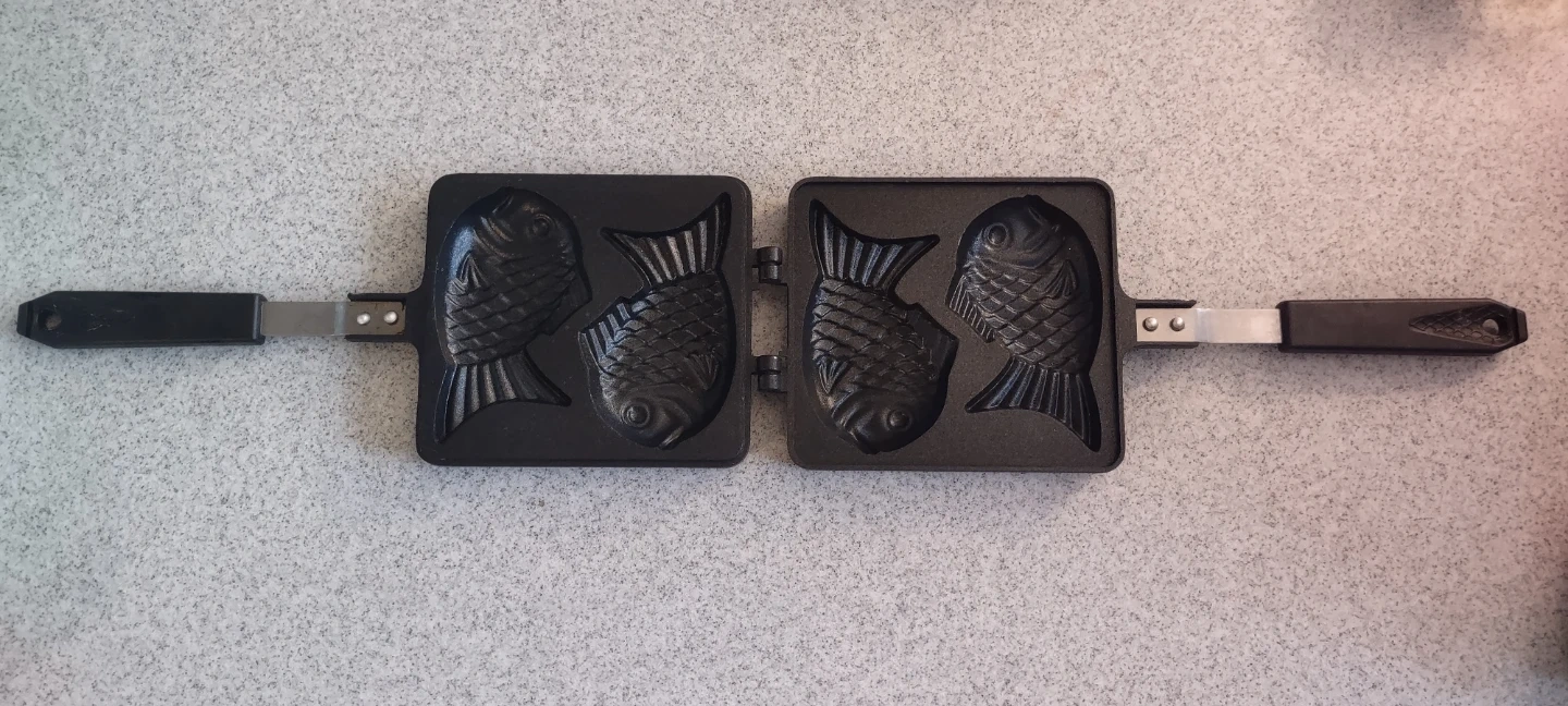 This is a CookKing double pan for making Korean style fish -Shaped pancakes, also known as taiyaki. It's a regular size and made of durable material. Use it to easily create these unique treats at home!