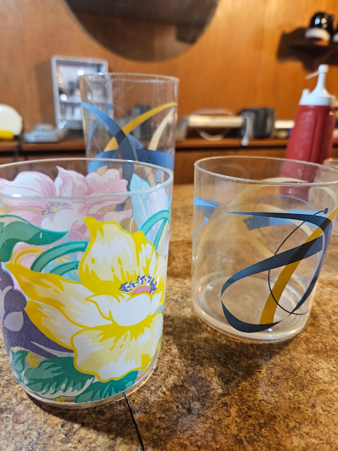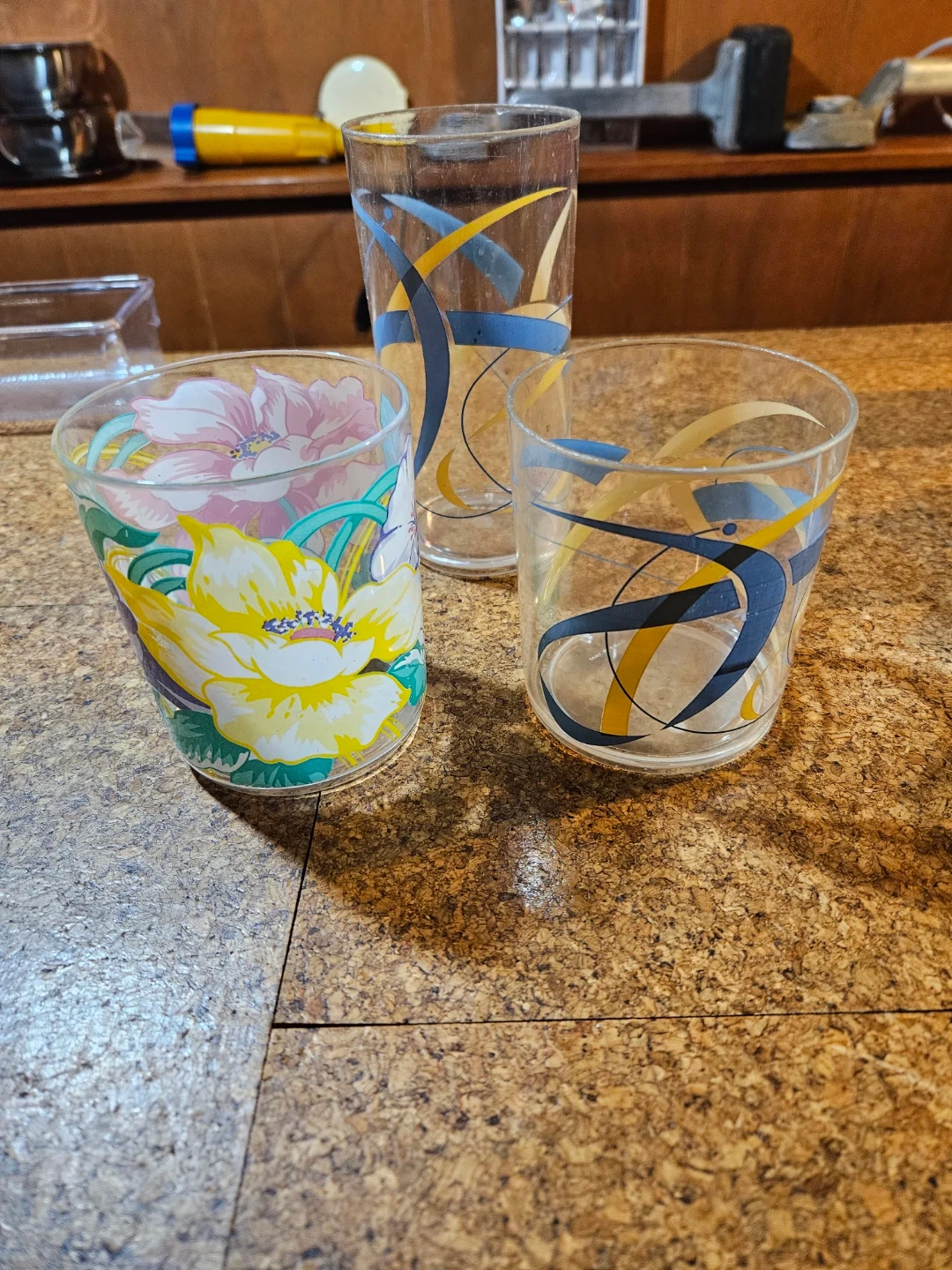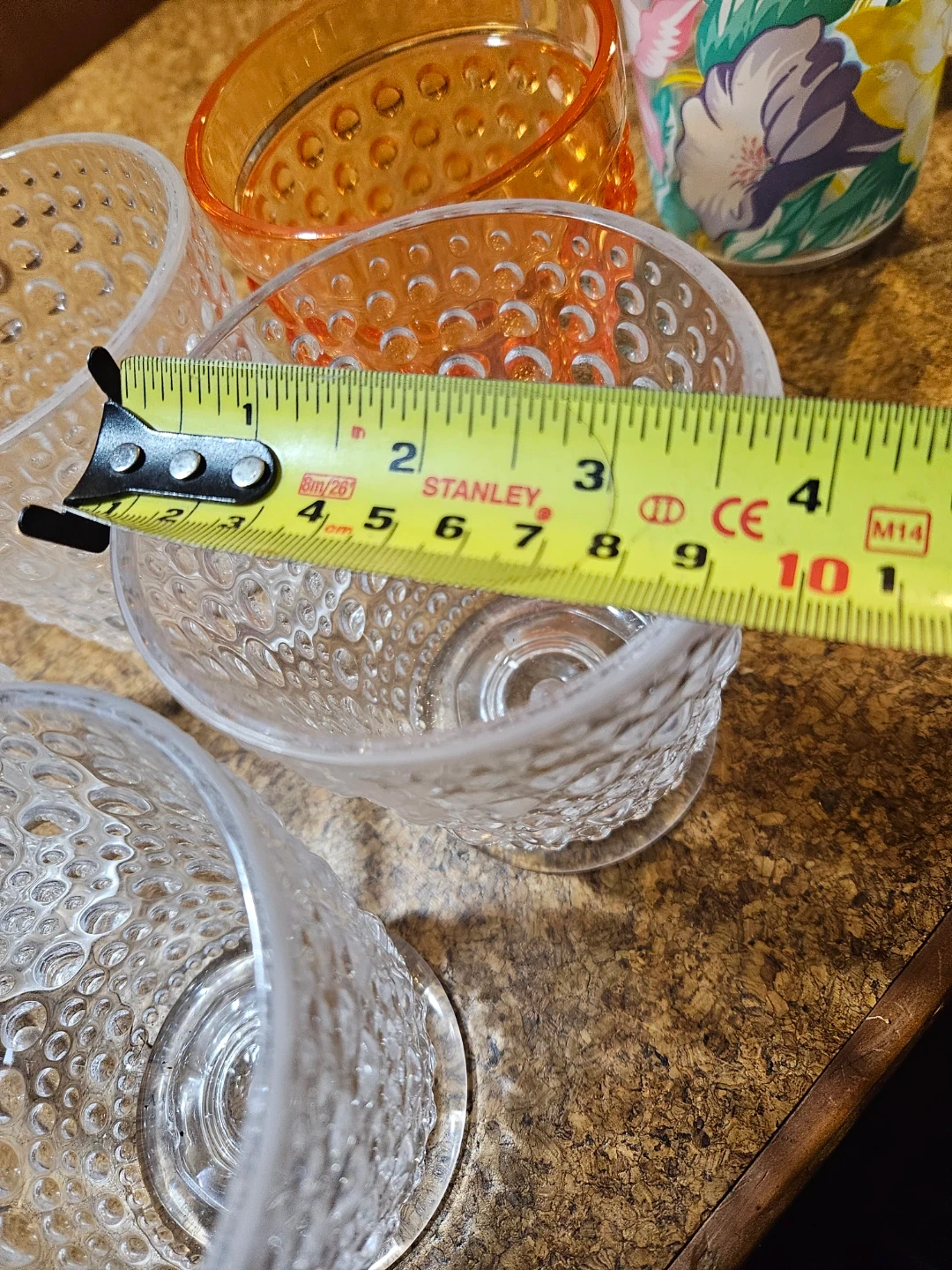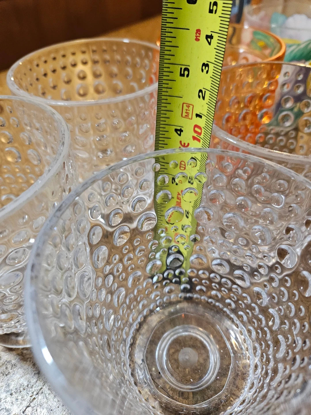 Here's a set of five vintage glasses, featuring a unique bubble texture design. Three of the glasses are clear, and one is clear with a floral design. One orange glass is also included. They measure approximately 4 inches tall.