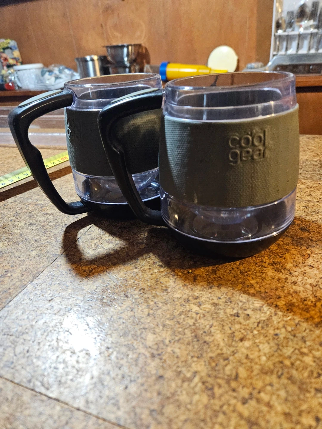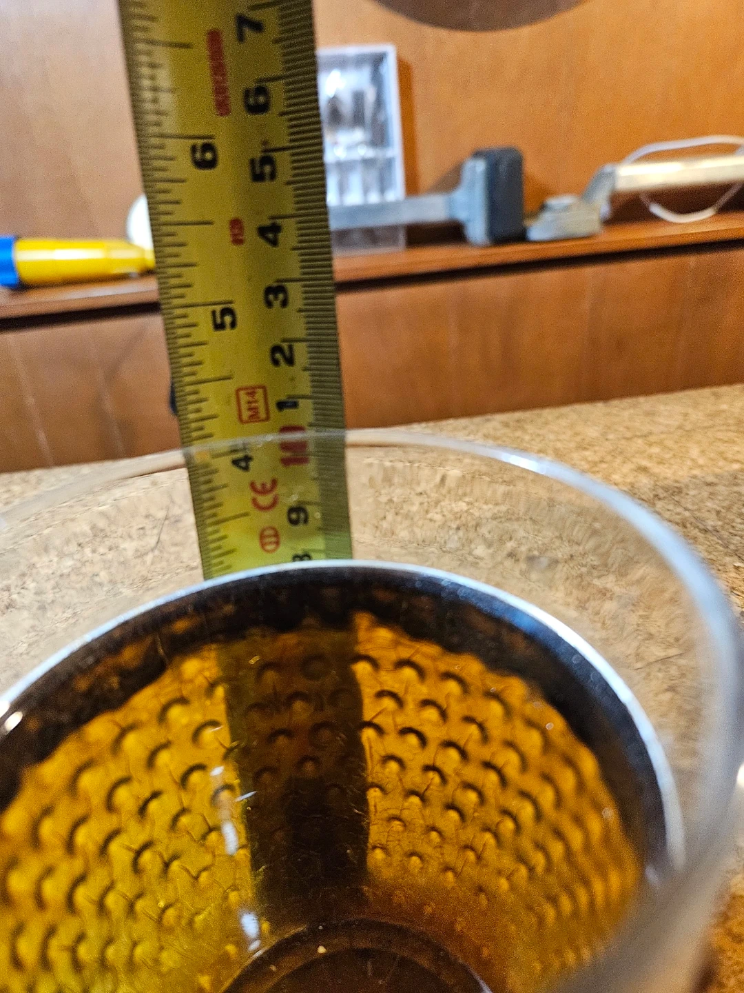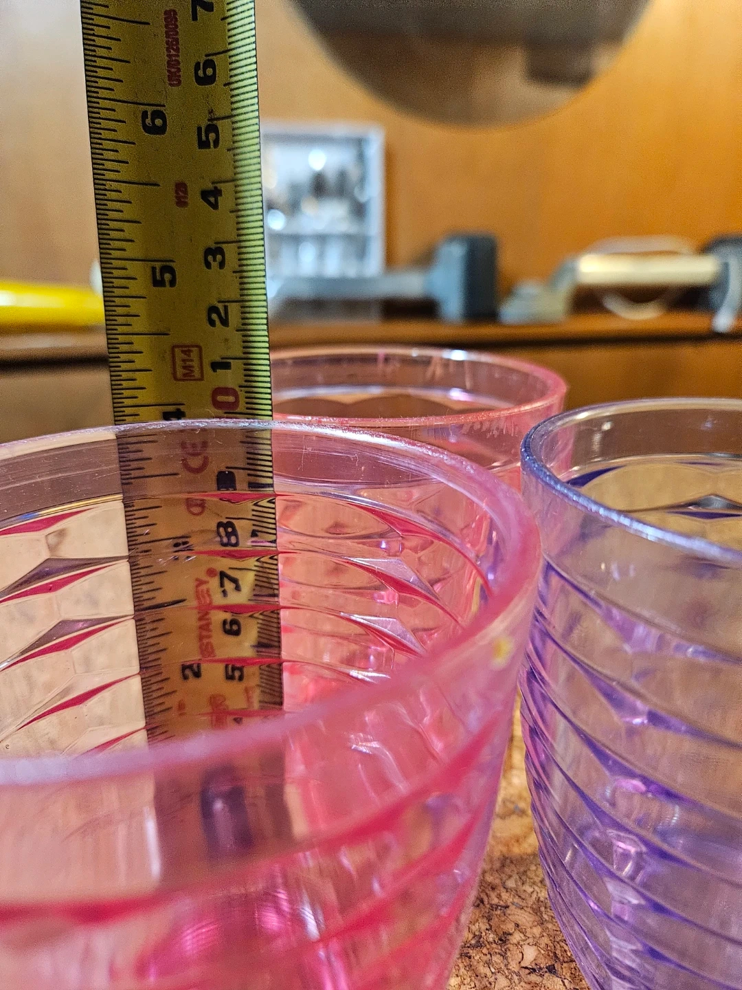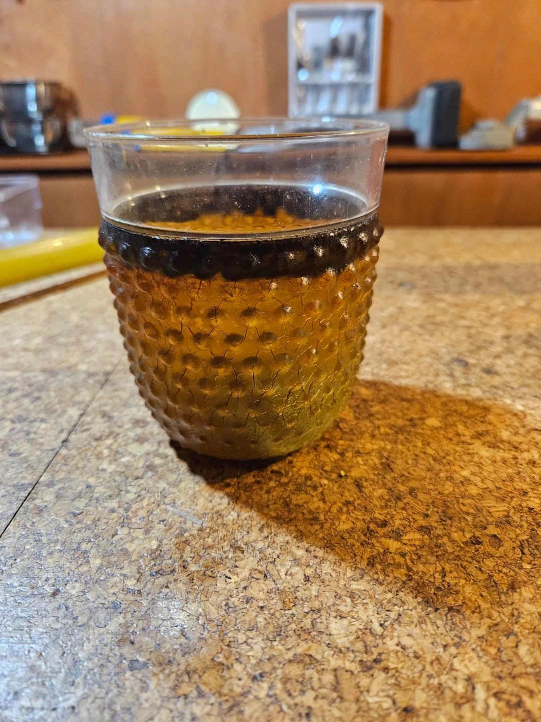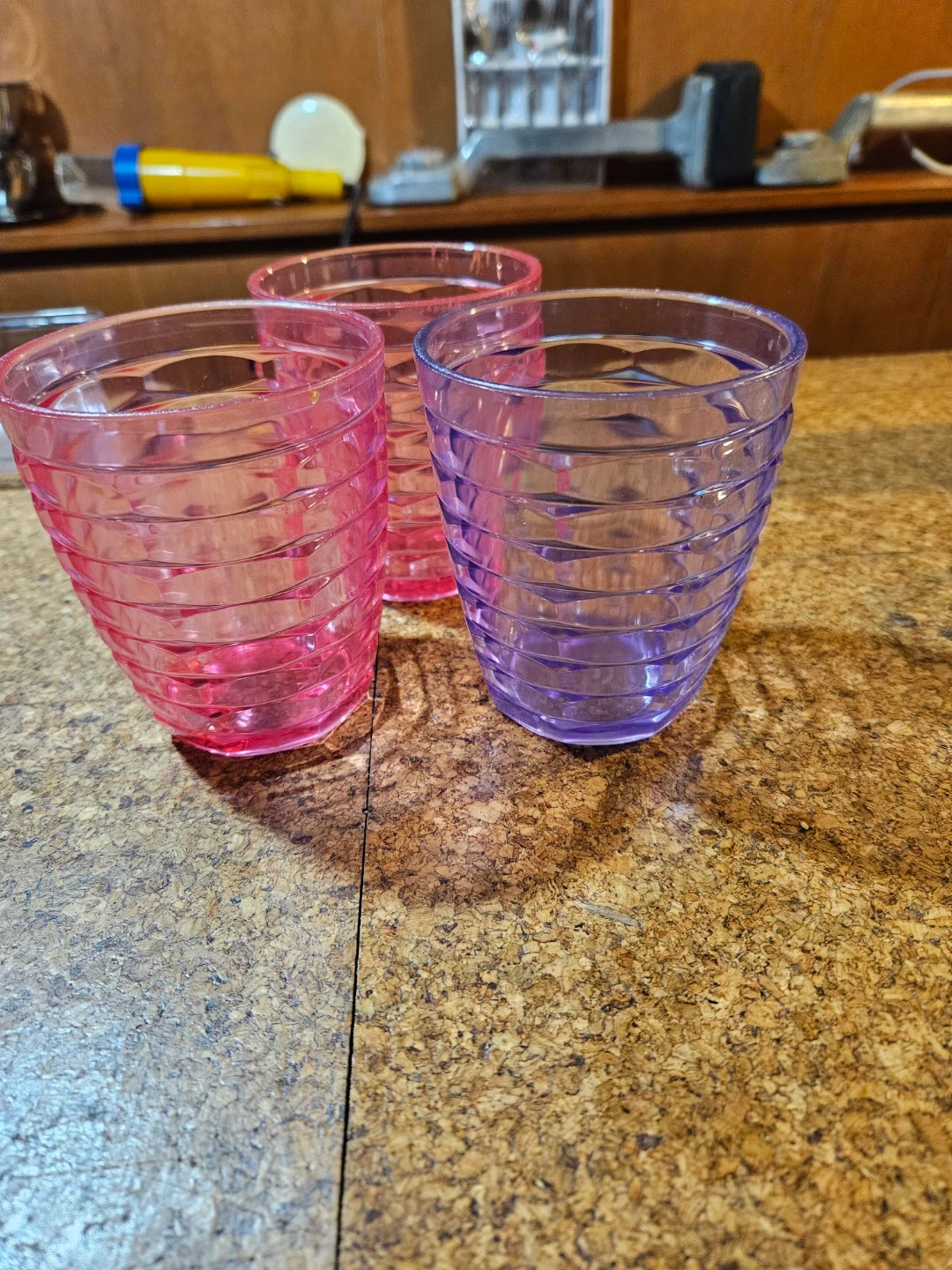 Here's a set of five vintage glasses, featuring a unique bubble texture design. Three of the glasses are clear, and one is clear with a floral design. One orange glass is also included. They measure approximately 4 inches tall.