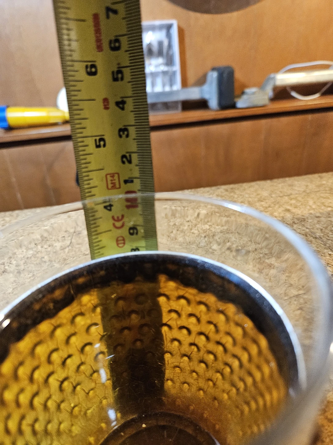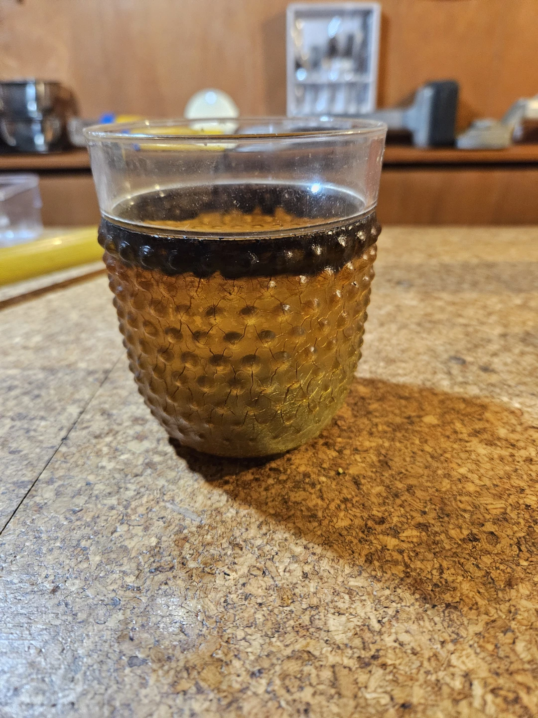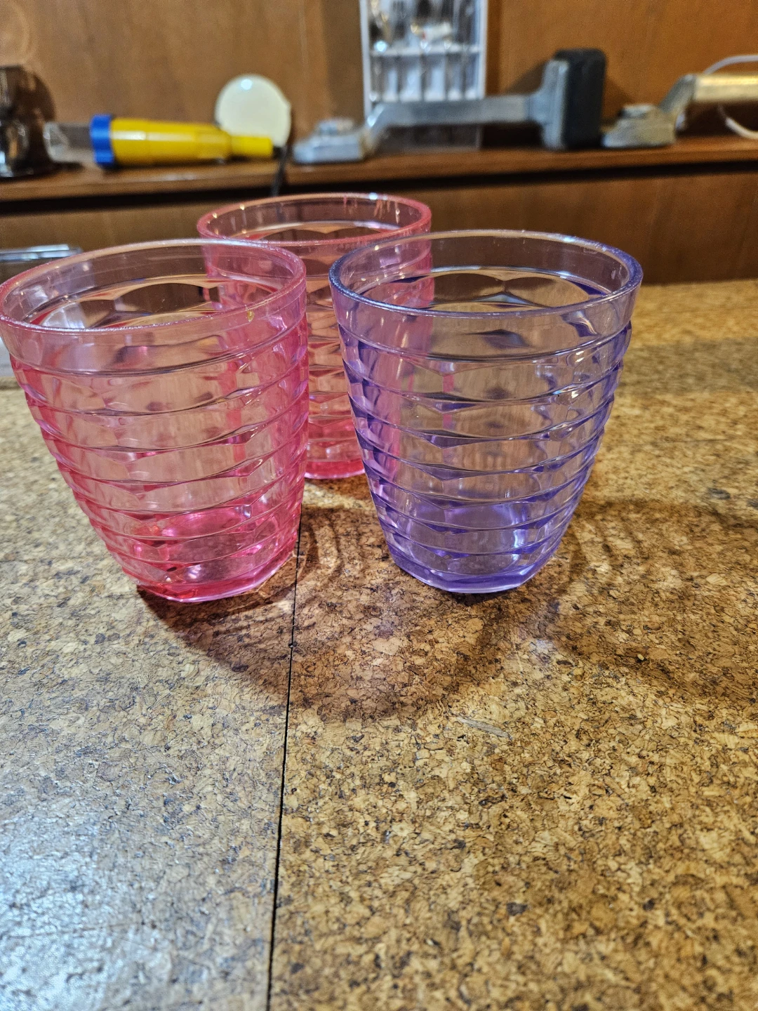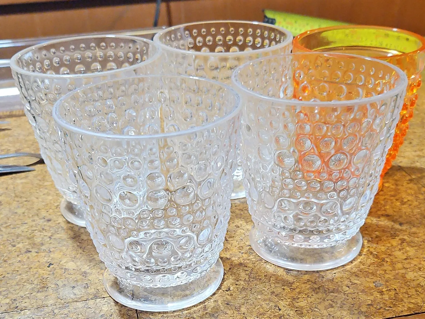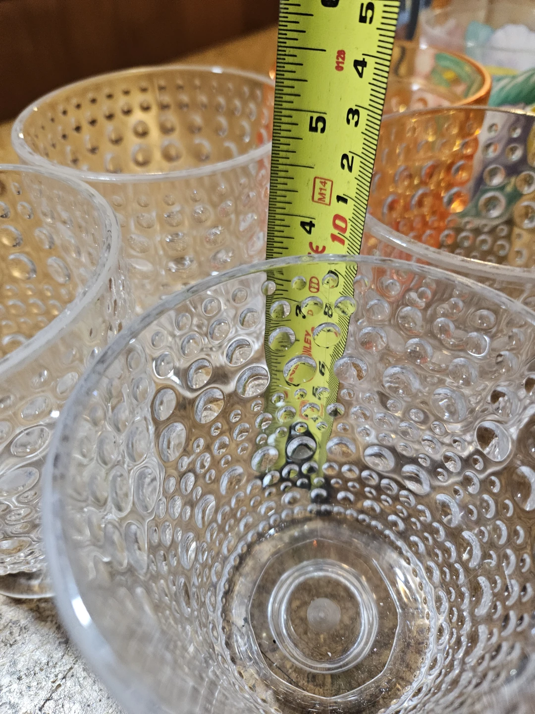 Here's a set of five vintage glasses, featuring a unique bubble texture design. Three of the glasses are clear, and one is clear with a floral design. One orange glass is also included. They measure approximately 4 inches tall.