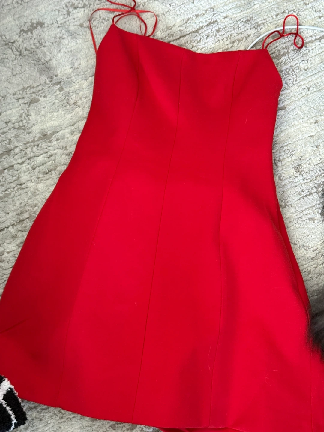A bright red mini dress with thin spaghetti straps and a large decorative bow on the back. It's a stylish piece perfect for special occasions. The fabric appears to be a structured blend, ensuring a flattering silhouette.