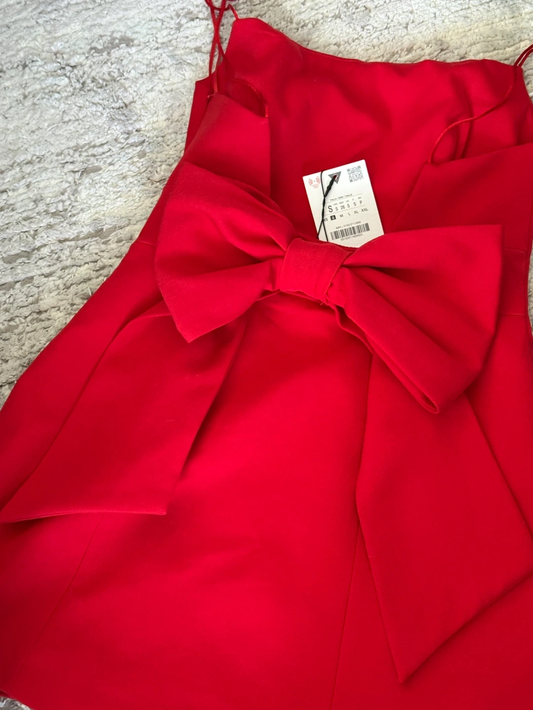 A bright red mini dress with thin spaghetti straps and a large decorative bow on the back. It's a stylish piece perfect for special occasions. The fabric appears to be a structured blend, ensuring a flattering silhouette.