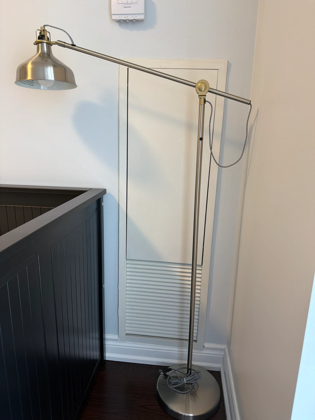 This is a brushed nickel adjustable floor lamp. It has a sleek metal design with an articulated arm for directing light. Perfect for reading or ambient lighting in any room!