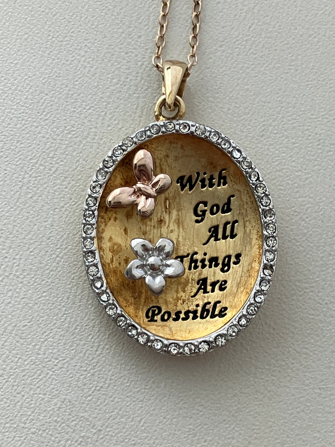 925 Sterling Silve Gold plated pendant & Chain 19" RL. The pendant features a message that reads, "With God All Things Are Possible", along with a butterfly and flower design, surrounded by rhinestones. Designed by Ralph Lauren.