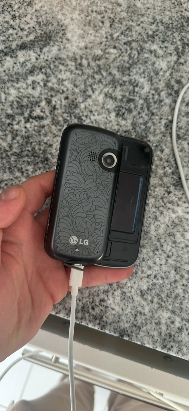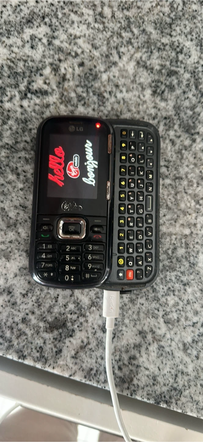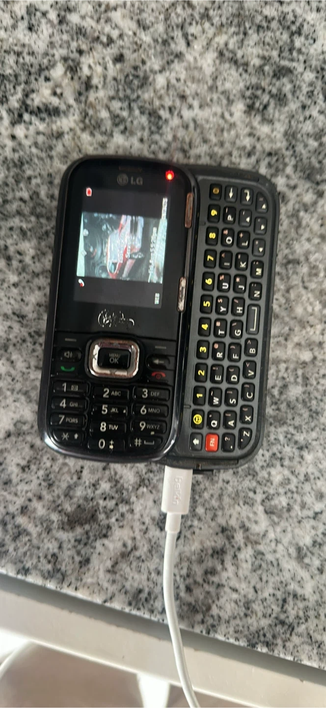 This is an LG slider phone featuring a full QWERTY keyboard. It has a unique floral design on the back. The phone is black and comes with a charging cable.