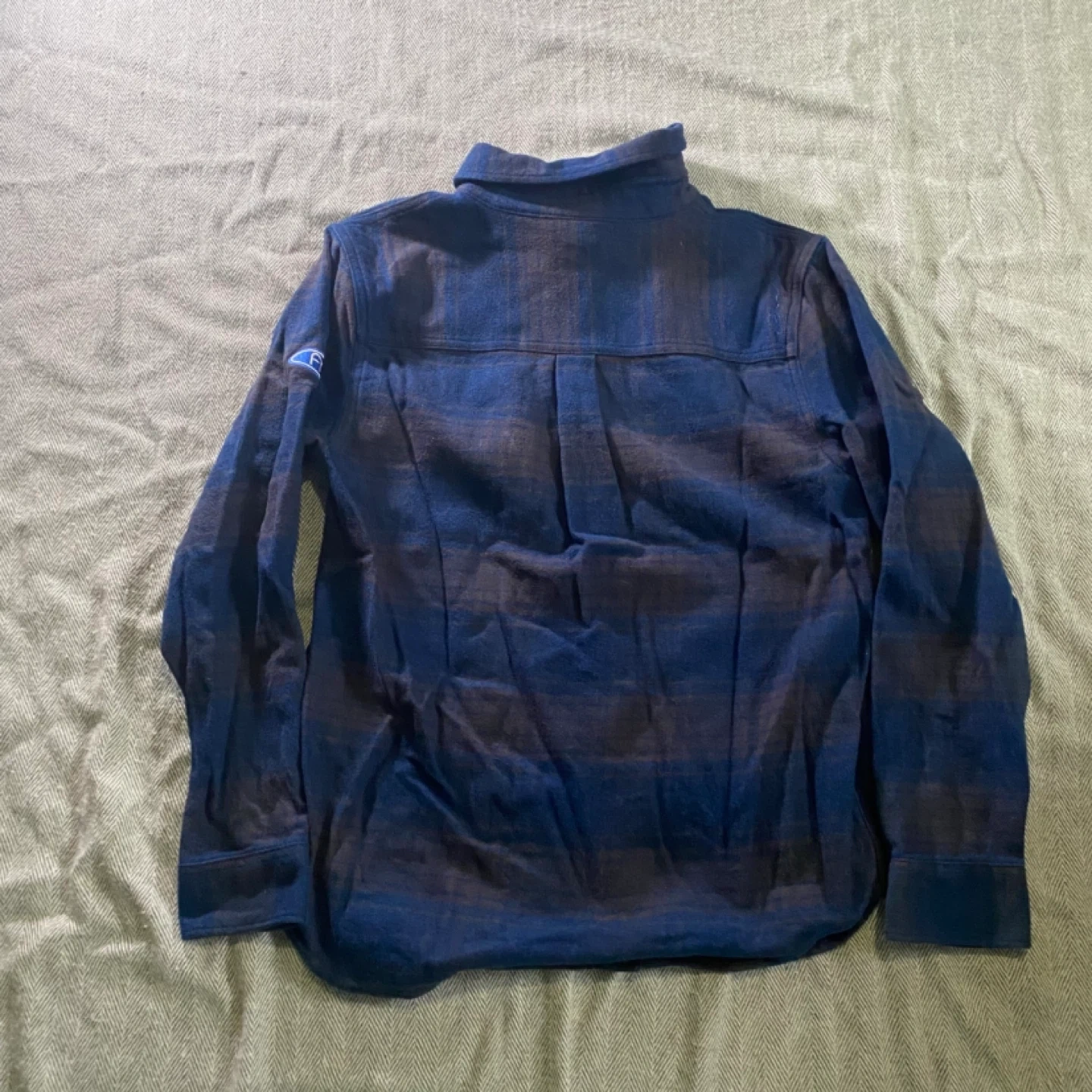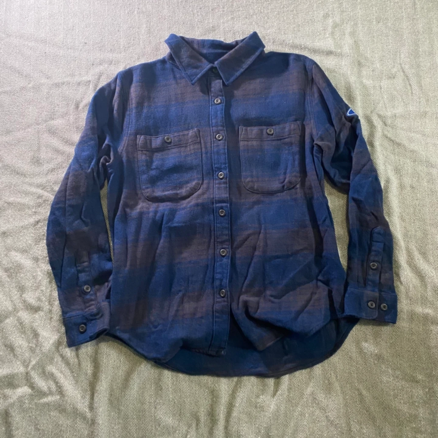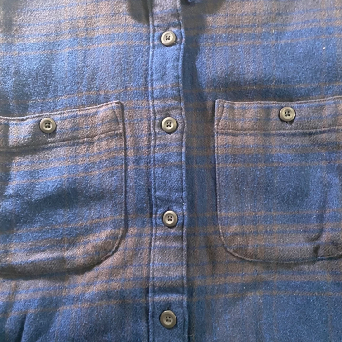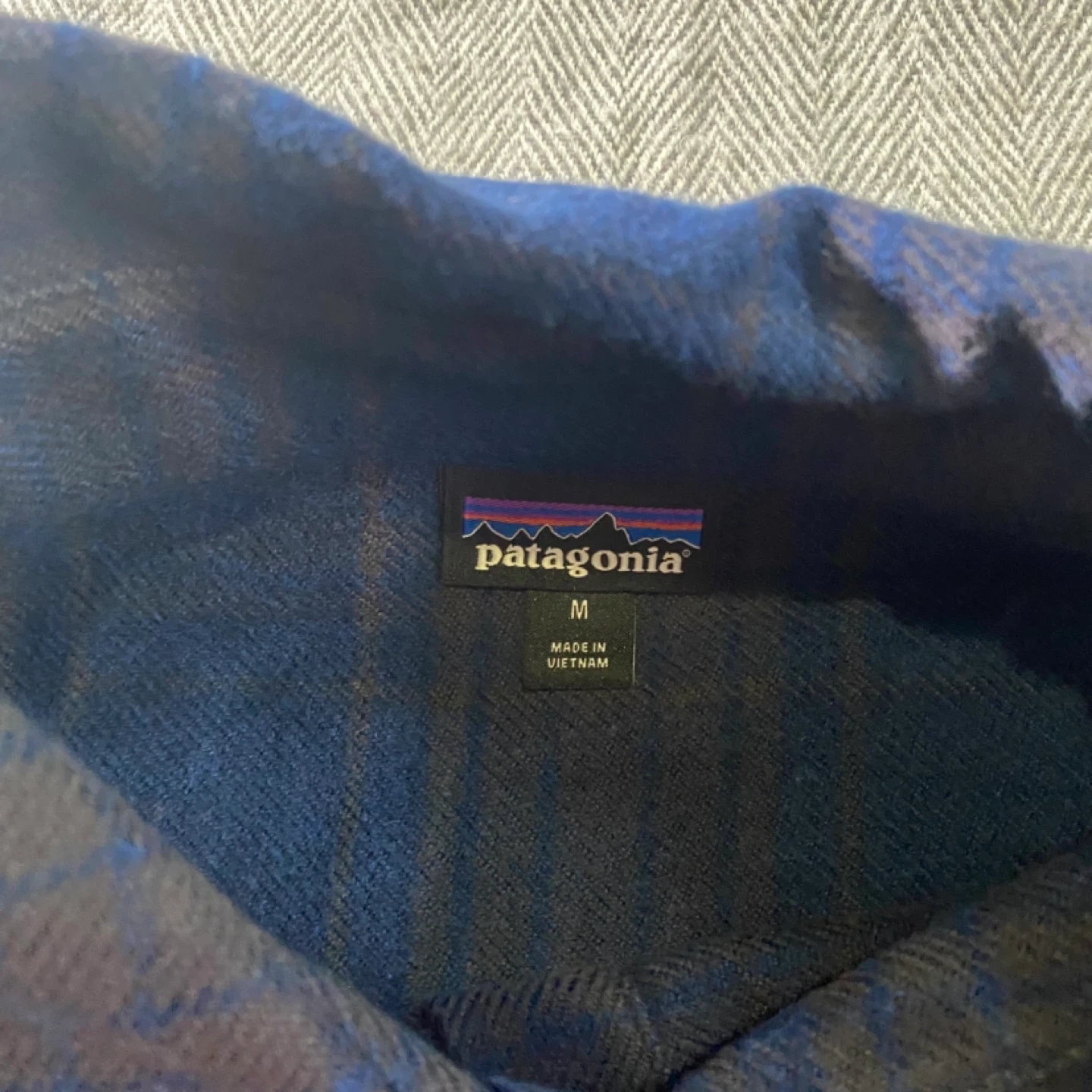 A cosy flannel shirt from Patagonia in a blue plaid pattern. It's a size medium and made in Vietnam. Perfect for cooler weather layering!
