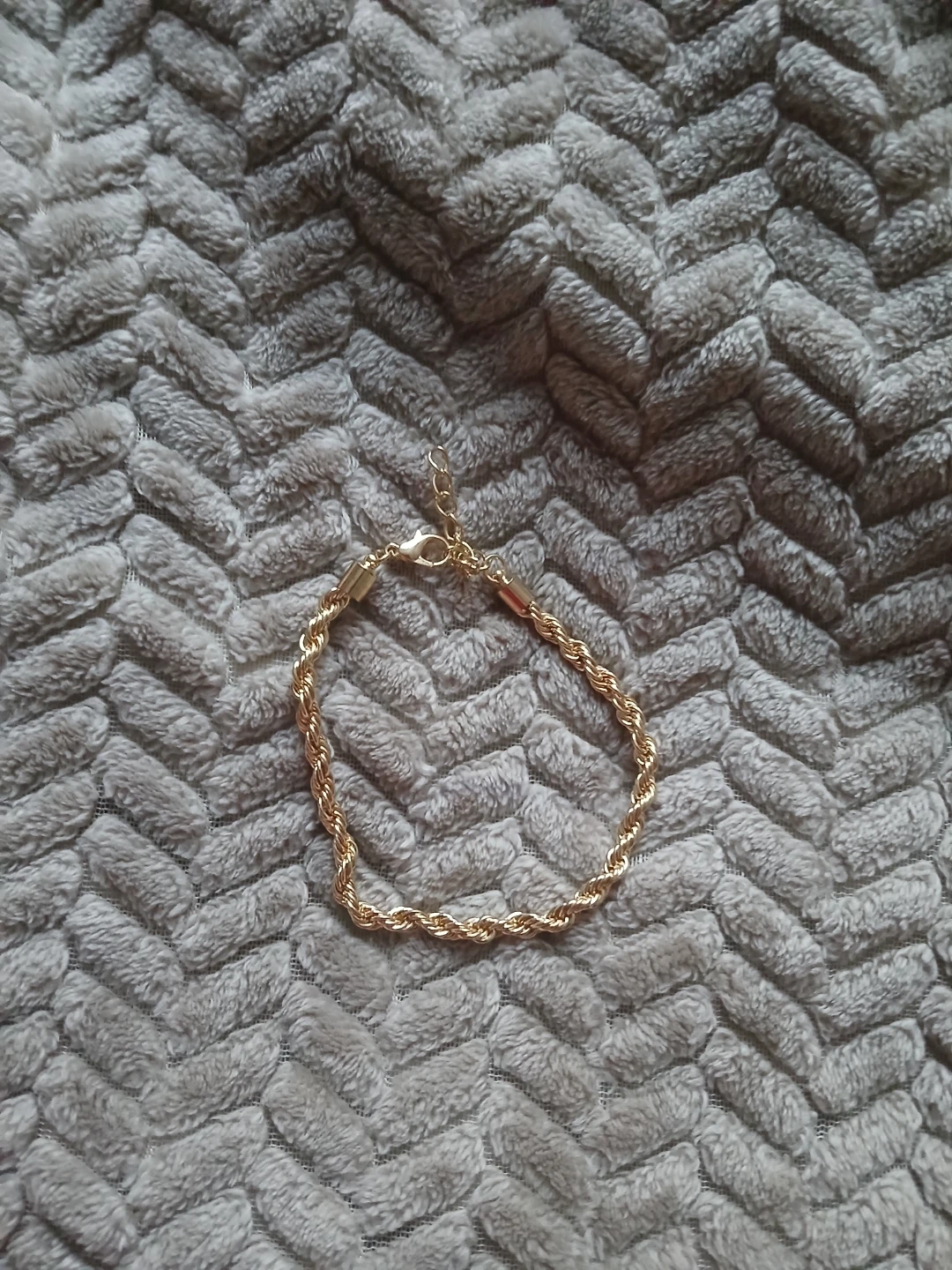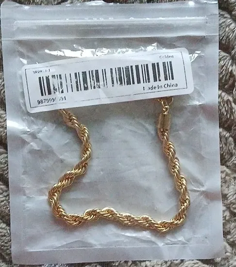 Selling a golden rope chain bracelet. It's a beautiful and simple piece that can add a touch of elegance to any outfit. The bracelet is in great condition and comes in its original packaging